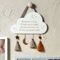 The hangable wooden plaque features a grey finish, enhanced by gold, painted detailing, including ‘Read Me A Story’ wording. Affixed to the cloud is a series of metal decorations and tassels, which hang below in complementary colours.