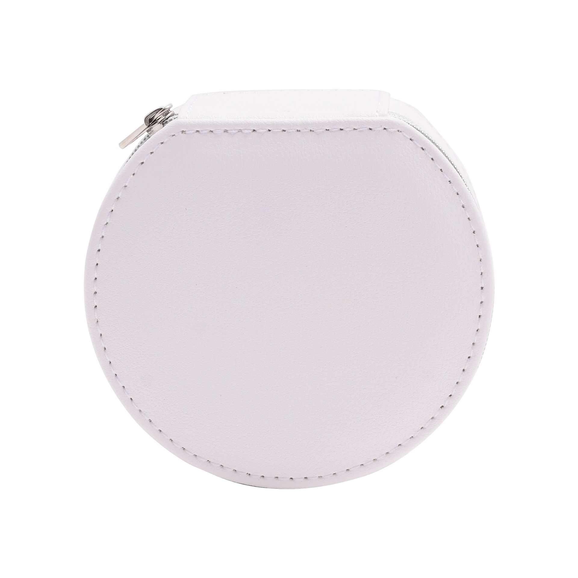 The simply stylish jewellery box is made from white faux leather, complete with matt finish. It opens to reveal a grey fabric storage area via its silver zipped lid.