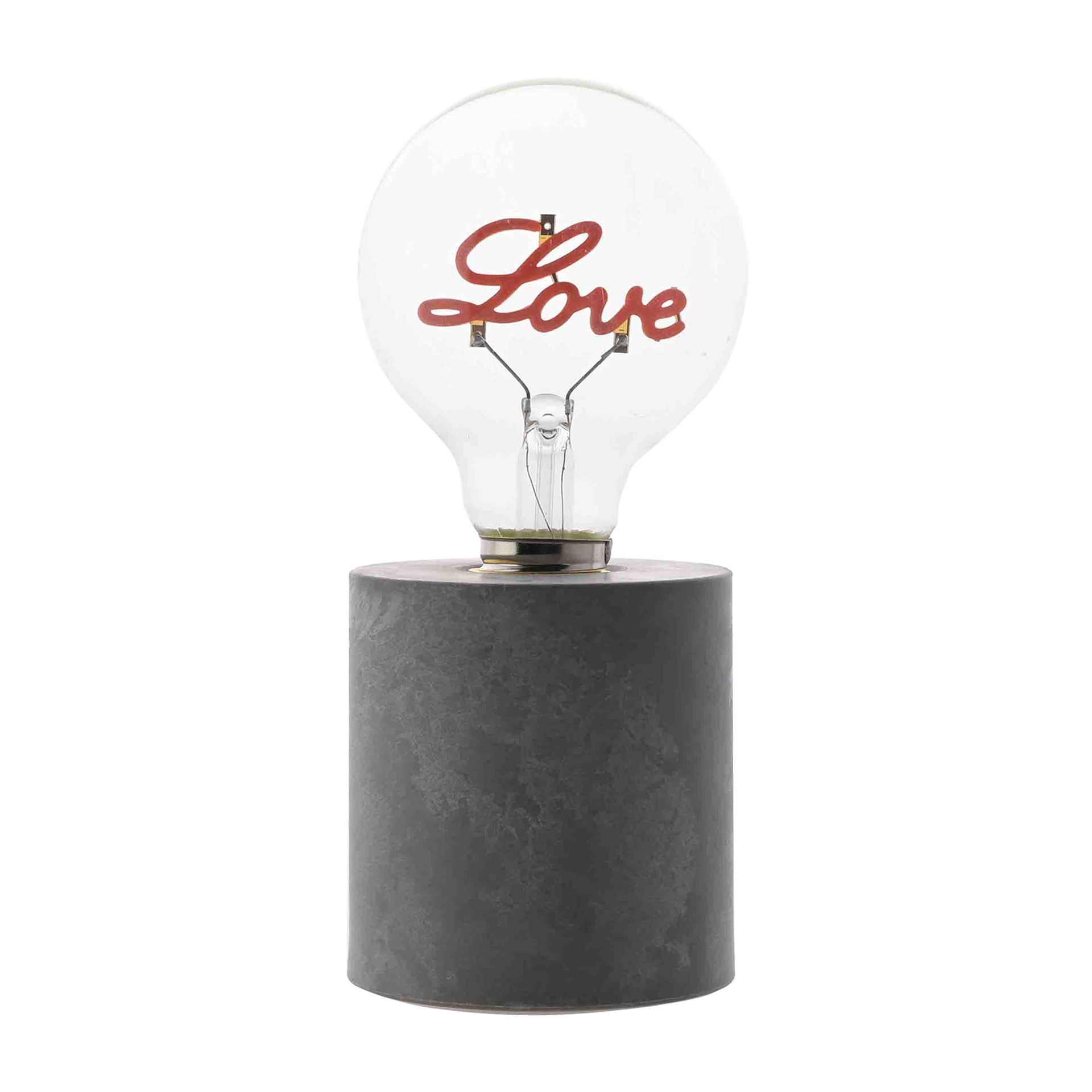 The cylindrical table light showcases a grey marble effect design, complete with matt finish. Inside the stand sits a screw-top LED light bulb, complete with 3D red ‘Love’ lettering.