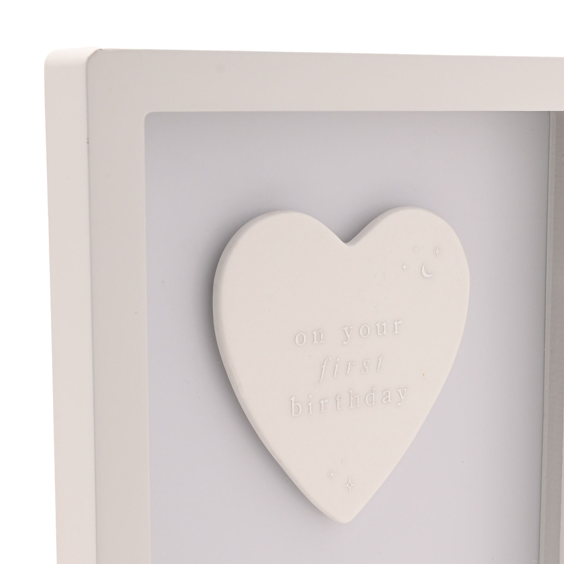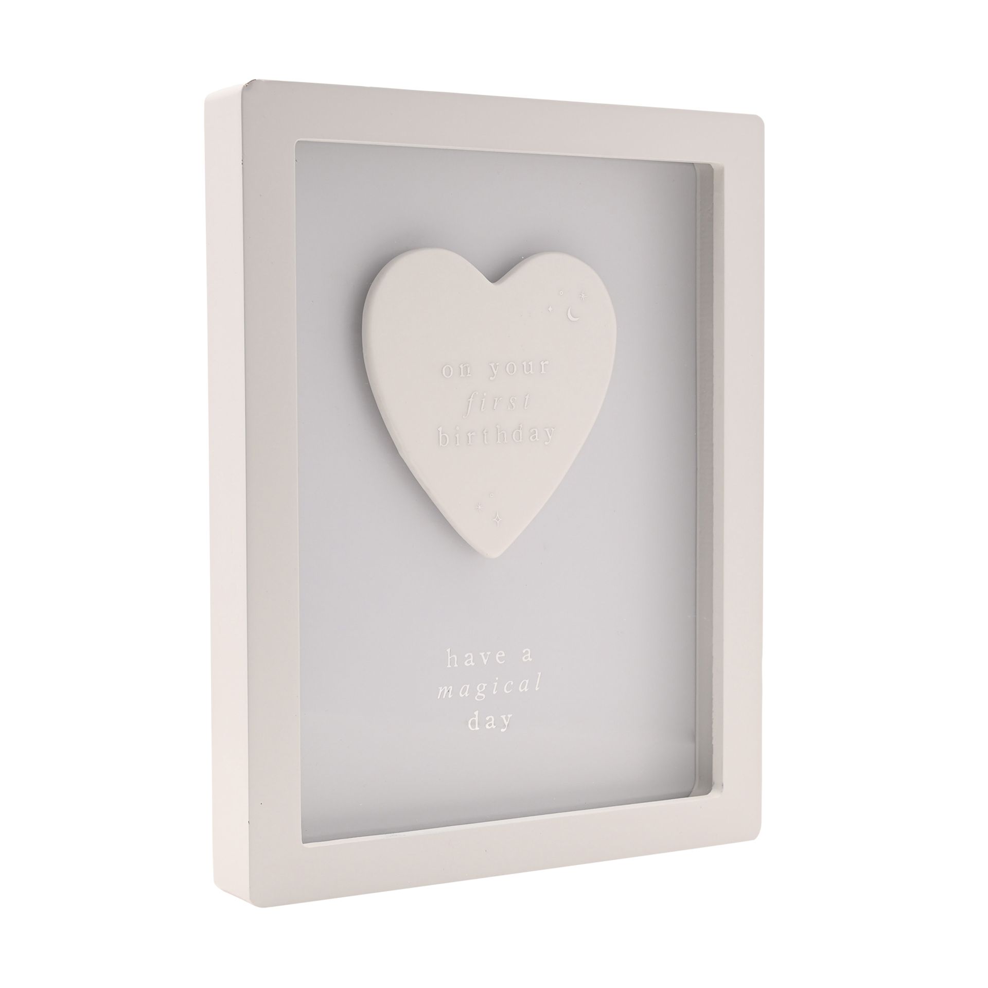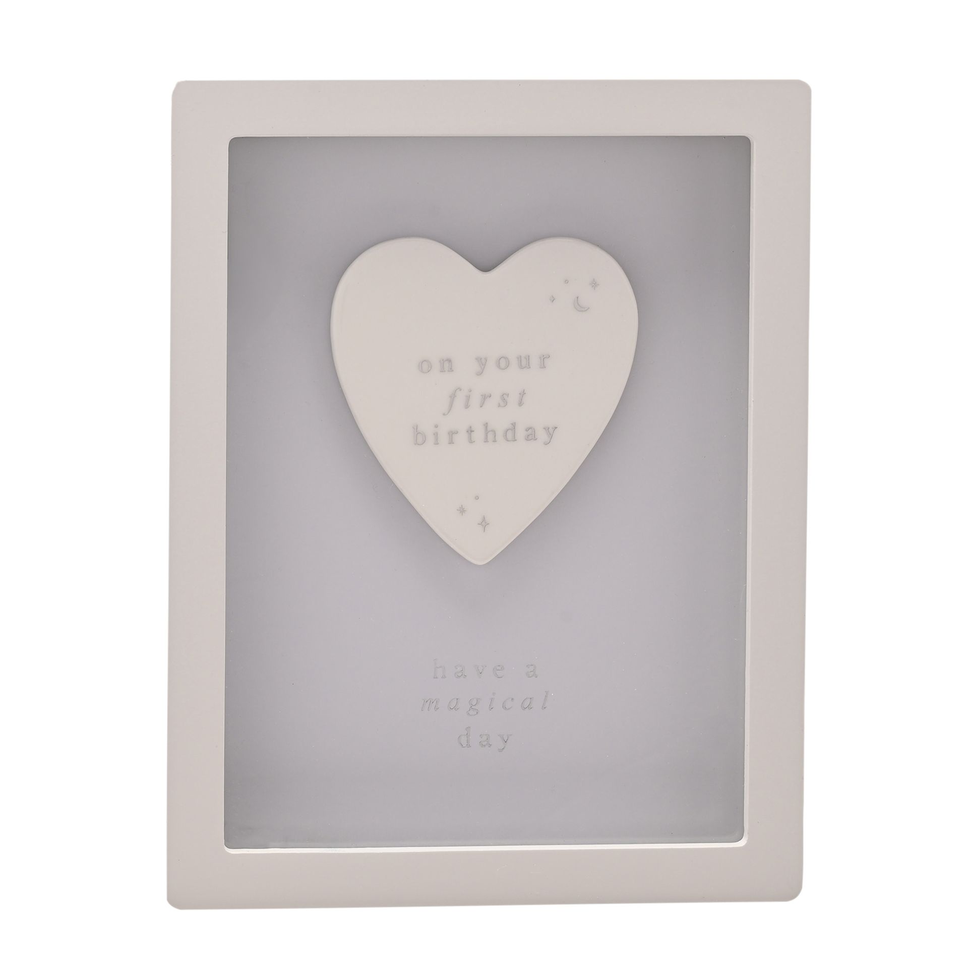 A sweet and sentimental framed plaque designed to celebrate a special first birthday. Featuring a ceramic heart with the message “On your first birthday” and the wording “Have a magical day” below, it creates a meaningful keepsake to treasure.