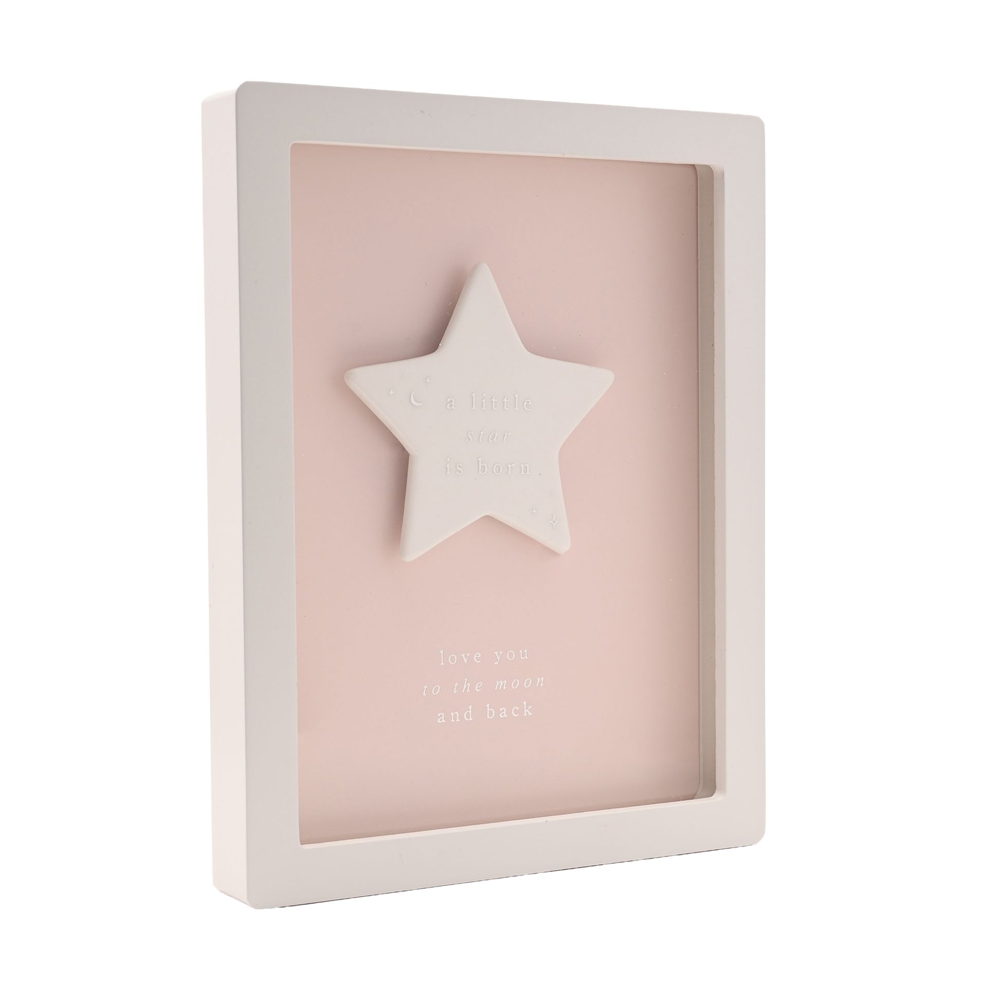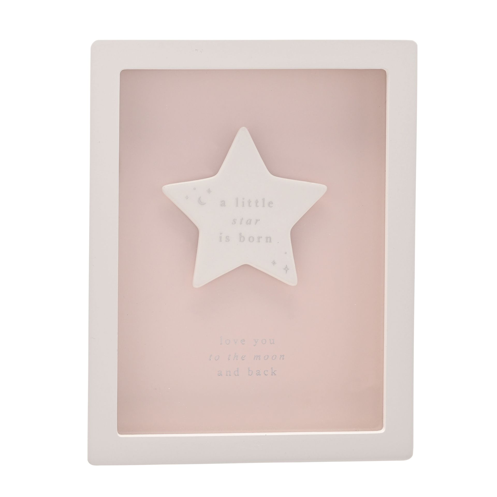A sweet and sentimental framed plaque designed to celebrate a precious new arrival. Featuring a ceramic star with the message “A little star is born” and the wording “Love you to the moon and back” below, it creates a meaningful keepsake to treasure.
