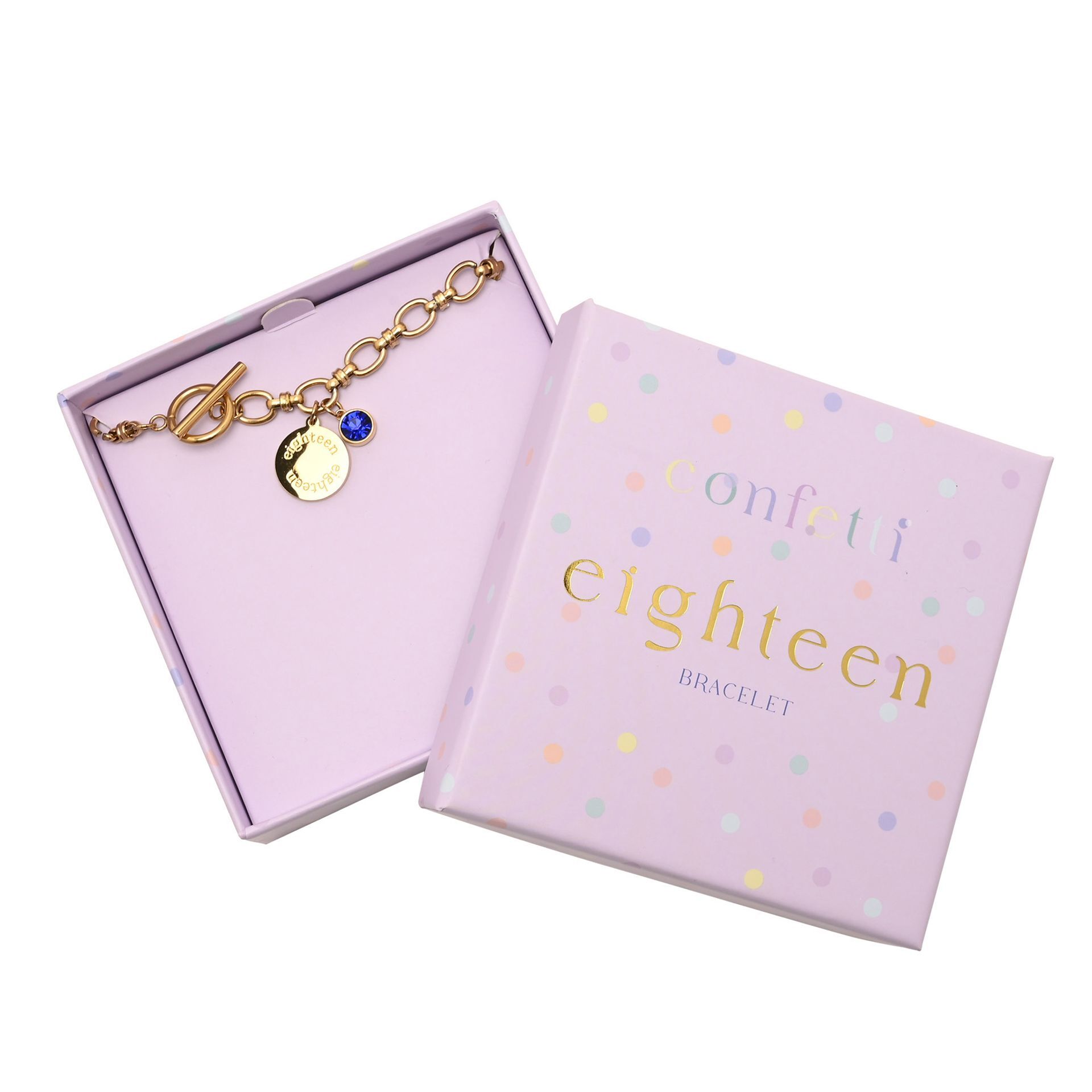 The CELEBRATIONS® Confetti Bracelet – 18 is a meaningful keepsake designed to mark a special milestone in style. Finished in a gold-tone with a delicate chain and toggle fastening, it features an engraved “eighteen” charm paired with a sparkling blue imitation birthstone for a subtle pop of colour.