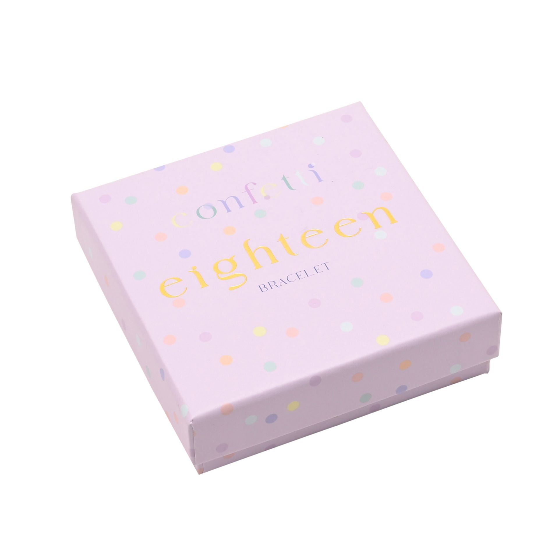Presented in a soft lilac gift box with gold foil “Confetti” lettering and a playful multicolour dot design, it’s ready to gift straight away — adding an extra touch of celebration before it’s even opened. Inside, the bracelet is neatly displayed to create a premium yet accessible gifting moment.