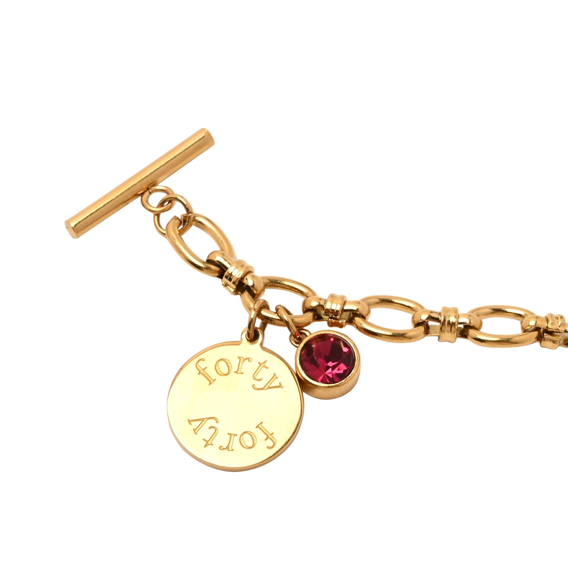 The CELEBRATIONS® Confetti Bracelet – 40 is a timeless keepsake designed to celebrate a meaningful milestone. Finished in a gold-tone with a classic chain and toggle fastening, it features an engraved “forty” charm paired with a rich pink imitation birthstone for a subtle yet eye-catching sparkle.