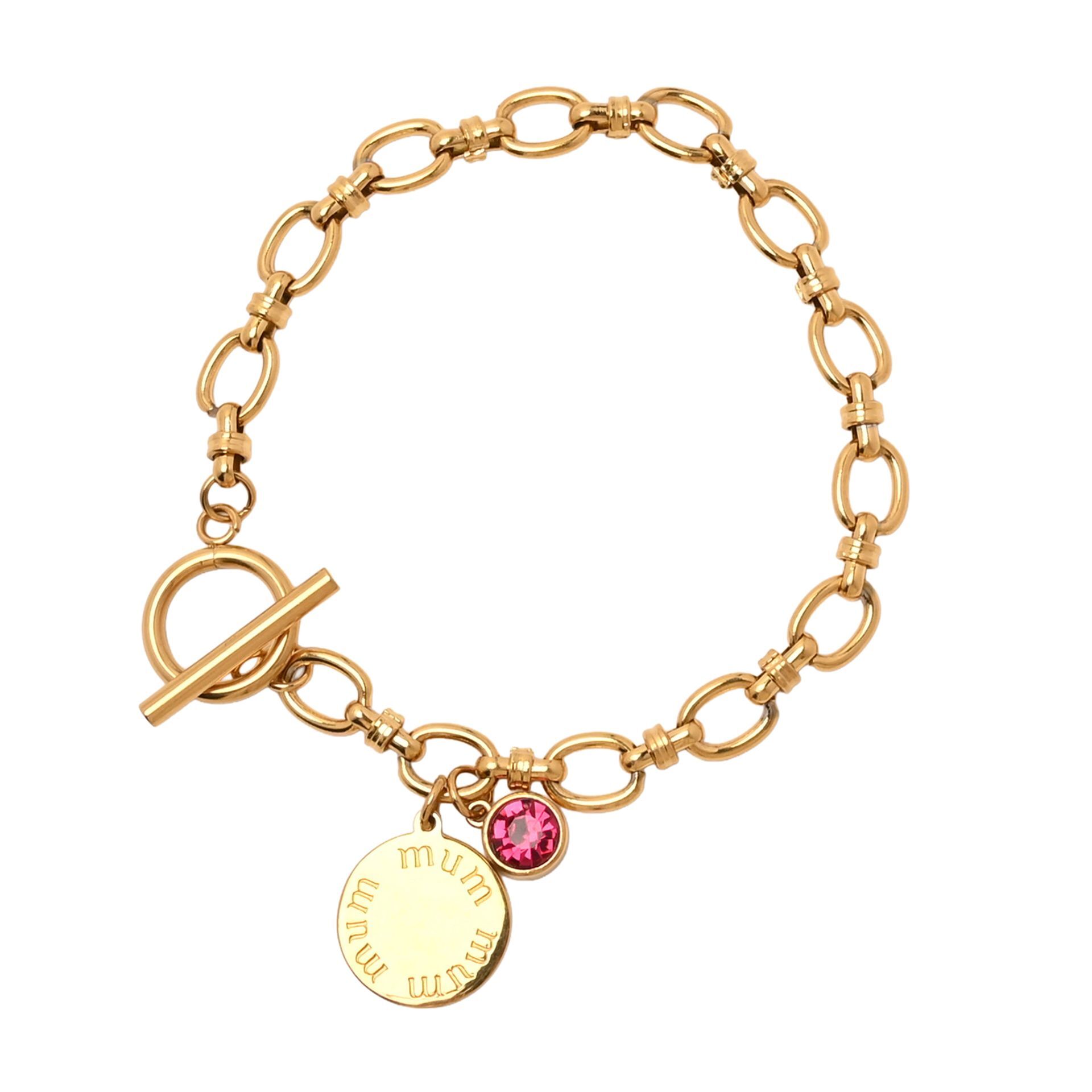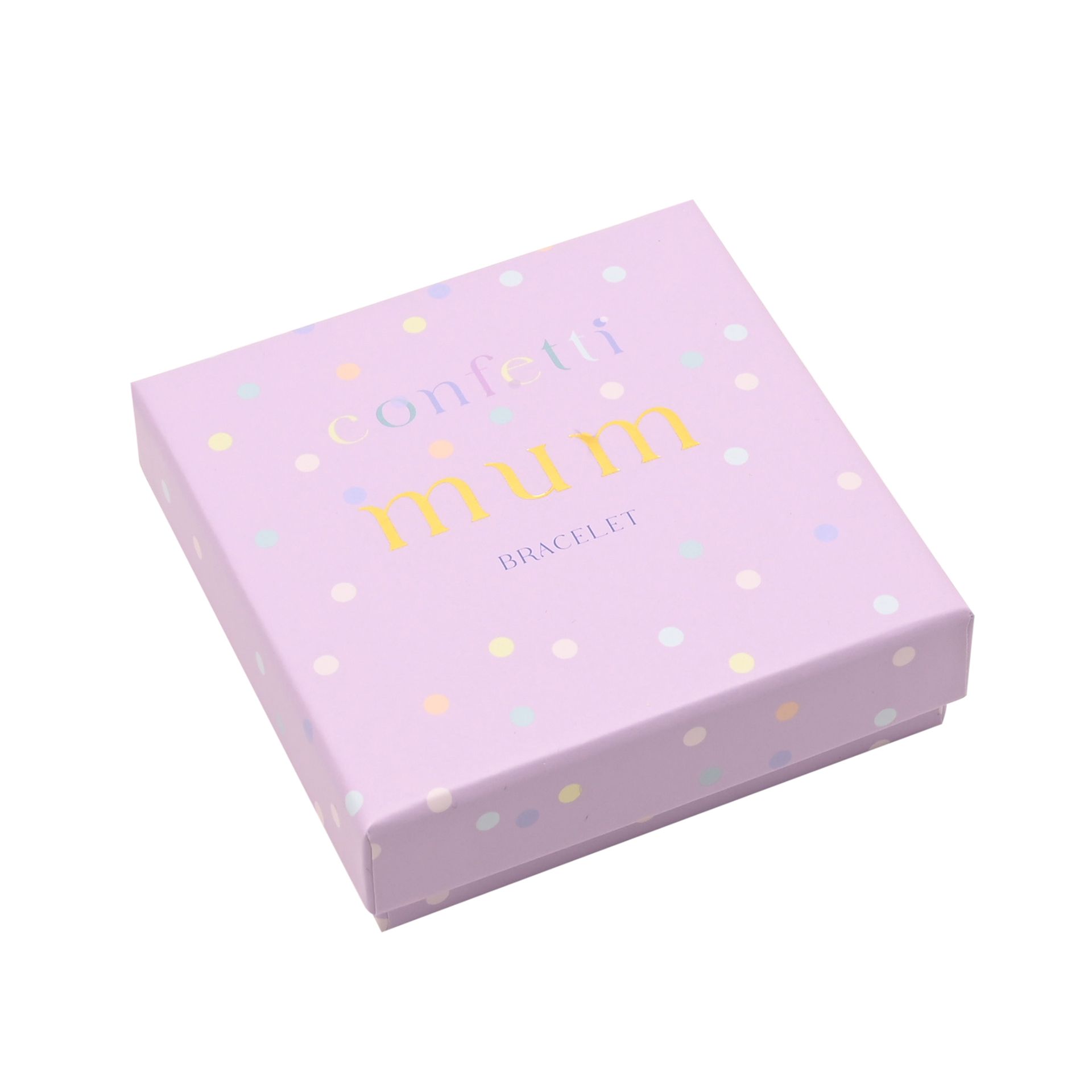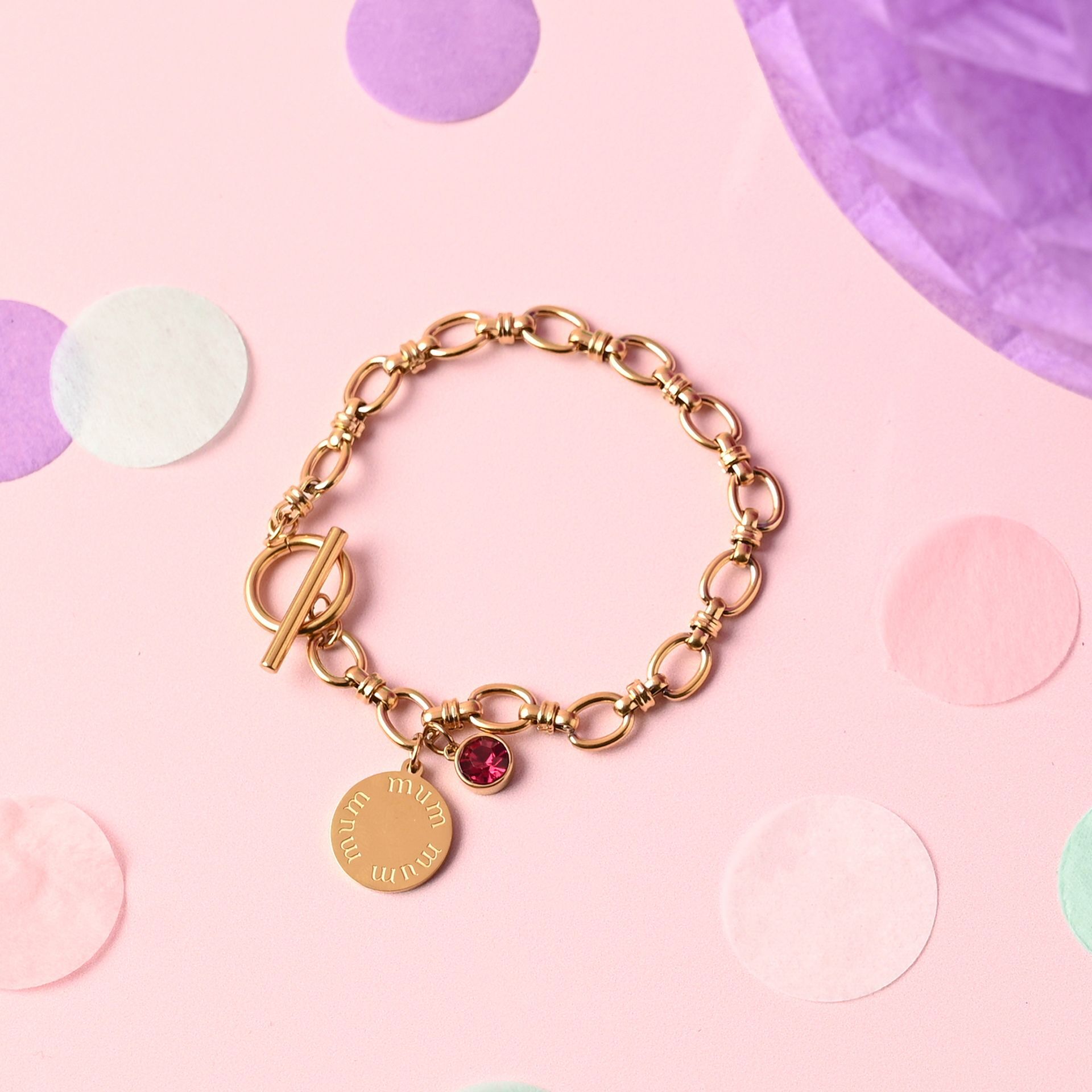 The CELEBRATIONS® Confetti Bracelet – Mum is a thoughtful keepsake designed to celebrate someone truly special. Finished in a gold-tone with a classic chain and toggle fastening, it features an engraved “mum” charm paired with a soft pink imitation birthstone for a delicate touch of sparkle.