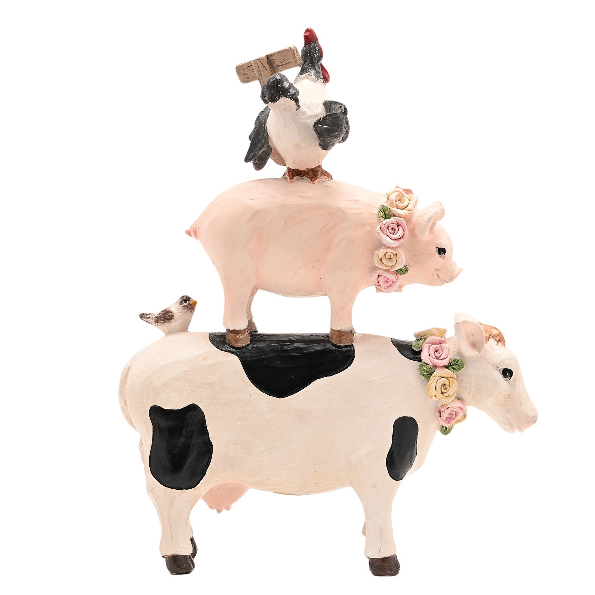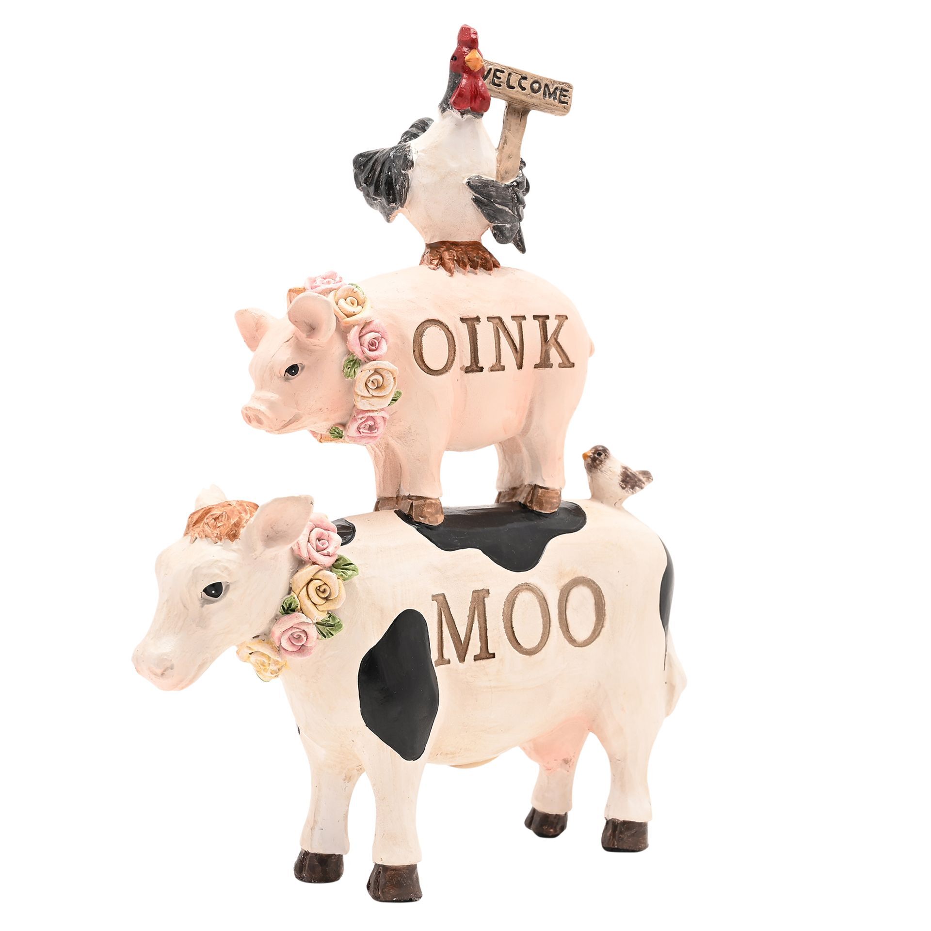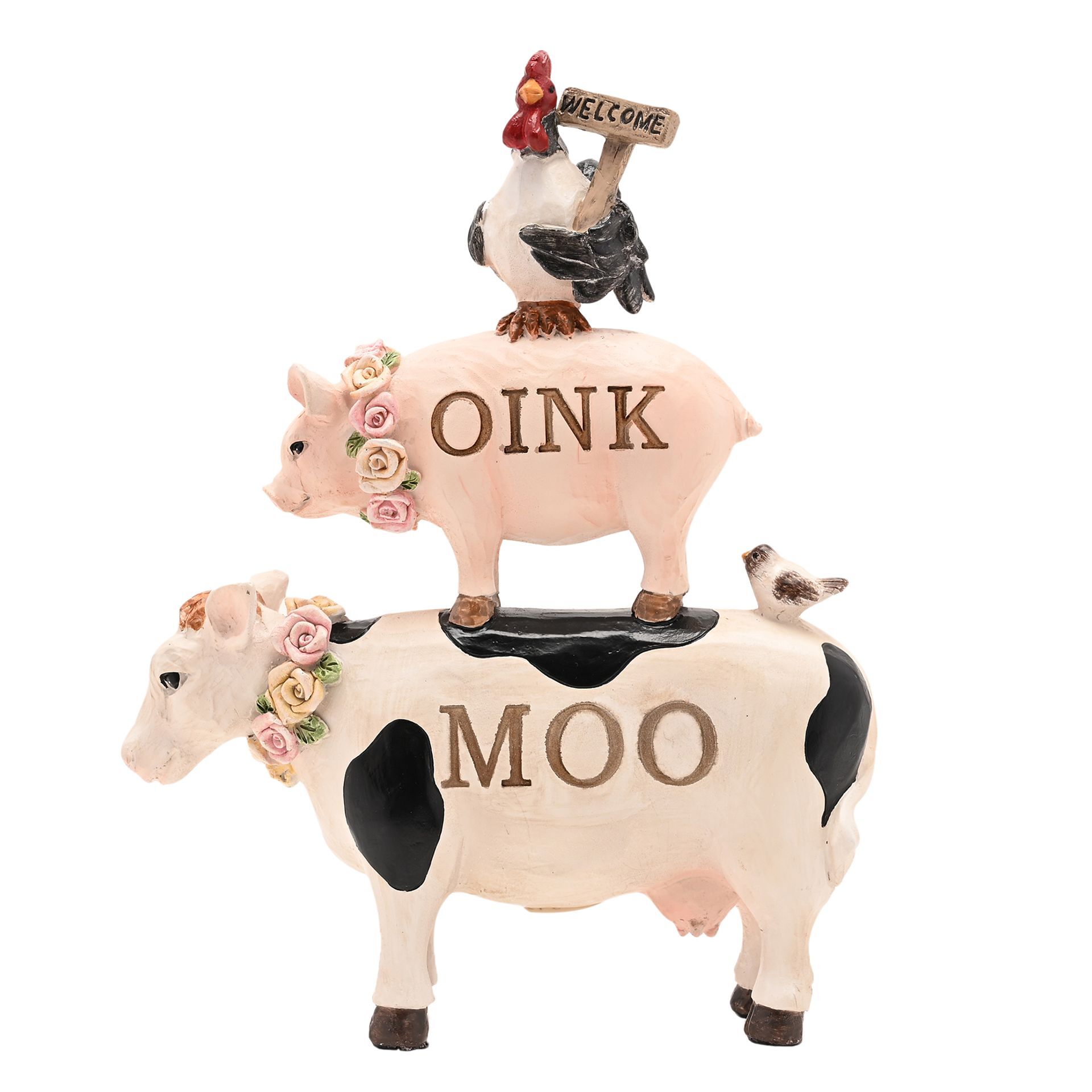 A charming decorative piece featuring a playful stack of farm animals, including a cow, pig, and chicken, each detailed with soft colours and rustic finishes. Accented with floral touches and the words “MOO” and “OINK,” it brings a light-hearted countryside feel to any space.