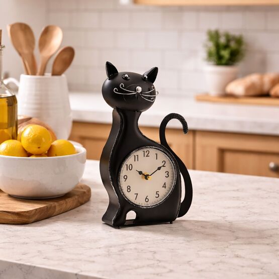 Finished in matte black with subtle detailing including whiskers, ears and a curled tail, it brings personality to shelves, desks or kitchen spaces. The clock face is neatly set into the body, providing a clear and easy-to-read display while enhancing the overall design.