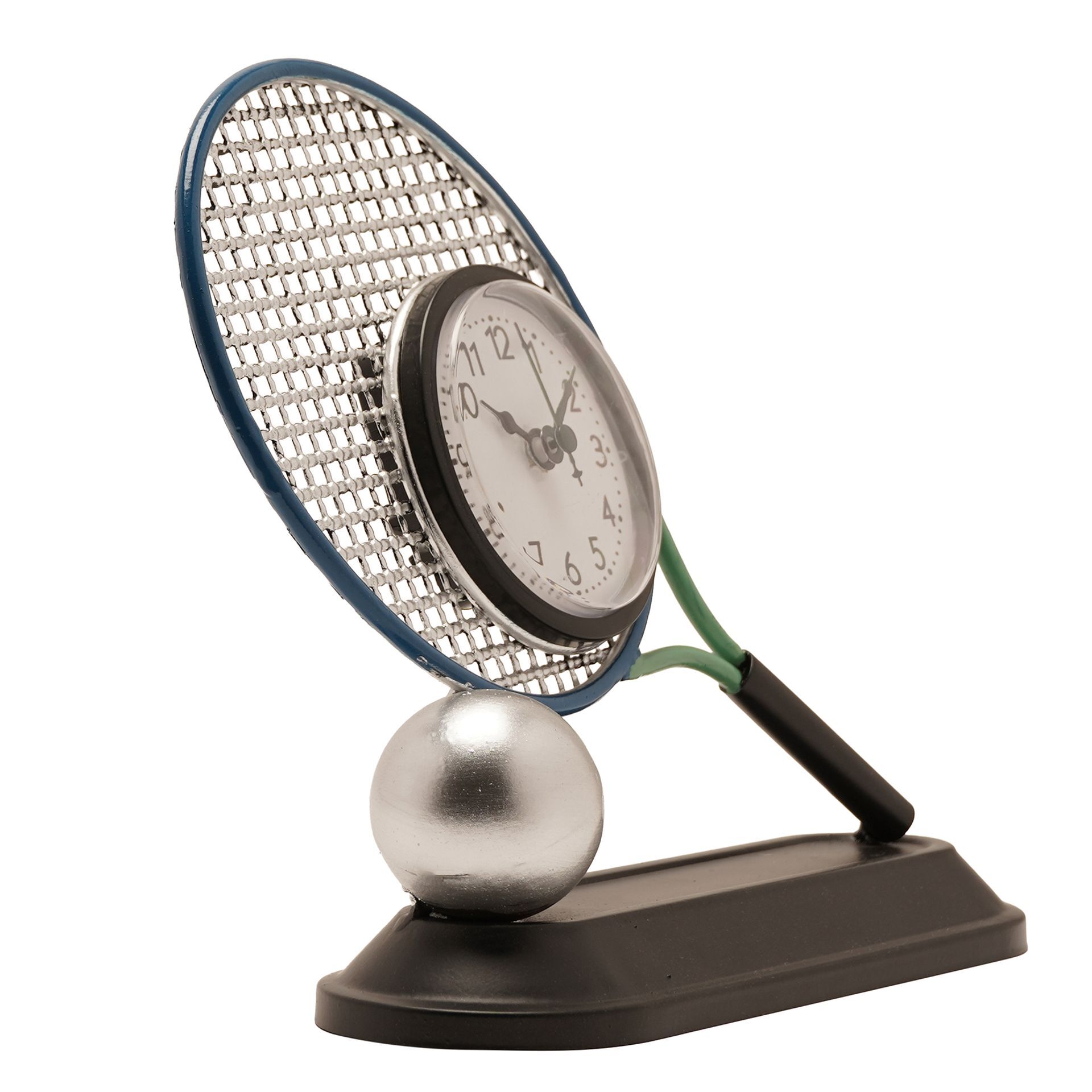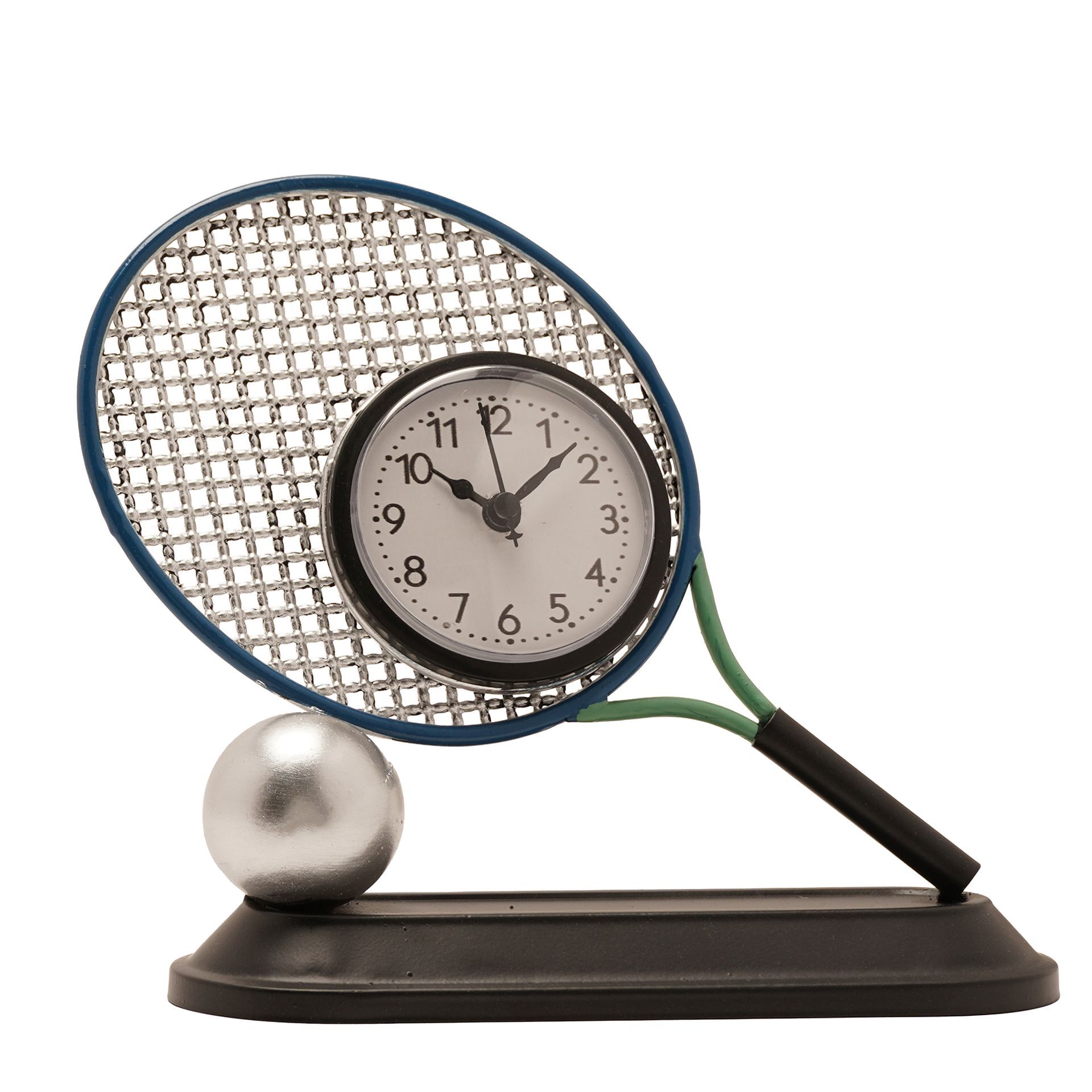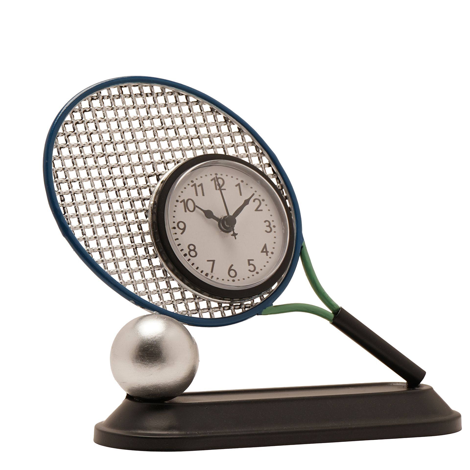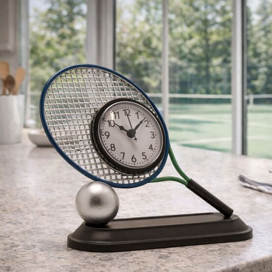 Featuring detailed racket stringing, a contrasting handle and a metallic tennis ball base, it captures the essence of the sport while incorporating a clear, easy-to-read clock face into the centre. The freestanding design makes it ideal for desks, shelves or bedside tables.
