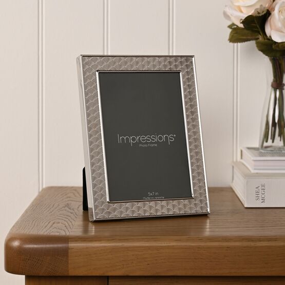 The Impressions Art Deco Scallop Metal Plated Silver Photo Frame 5" x 7" offers a stylish, vintage-inspired way to display cherished photographs. Featuring a polished silver-plated finish with an all-over scallop pattern, it draws on classic Art Deco design to create a refined and decorative look. Designed to hold a standard 5" x 7" image, the textured surface adds subtle detail while maintaining a clean, structured appearance. The geometric pattern enhances the frame’s visual appeal, making it suitable for both modern and traditional interiors. Part of the Impressions collection, this frame is ideal for gifting or for adding a sophisticated touch to shelves, desks or mantelpieces.