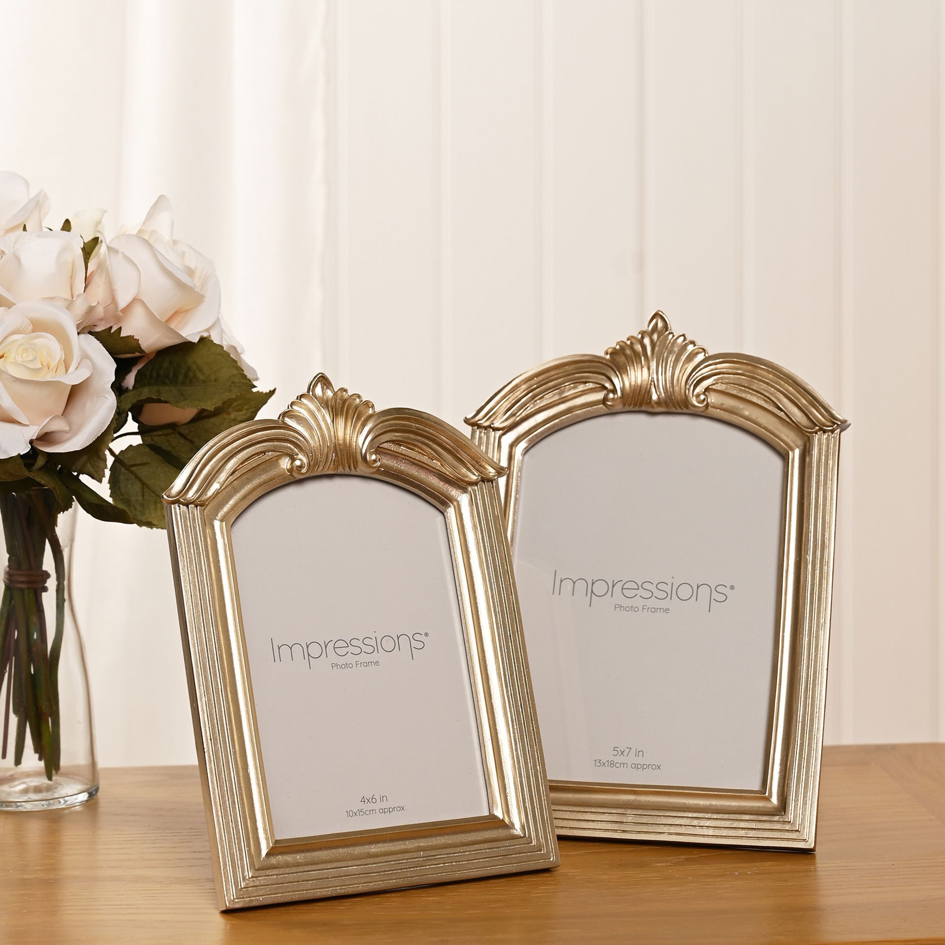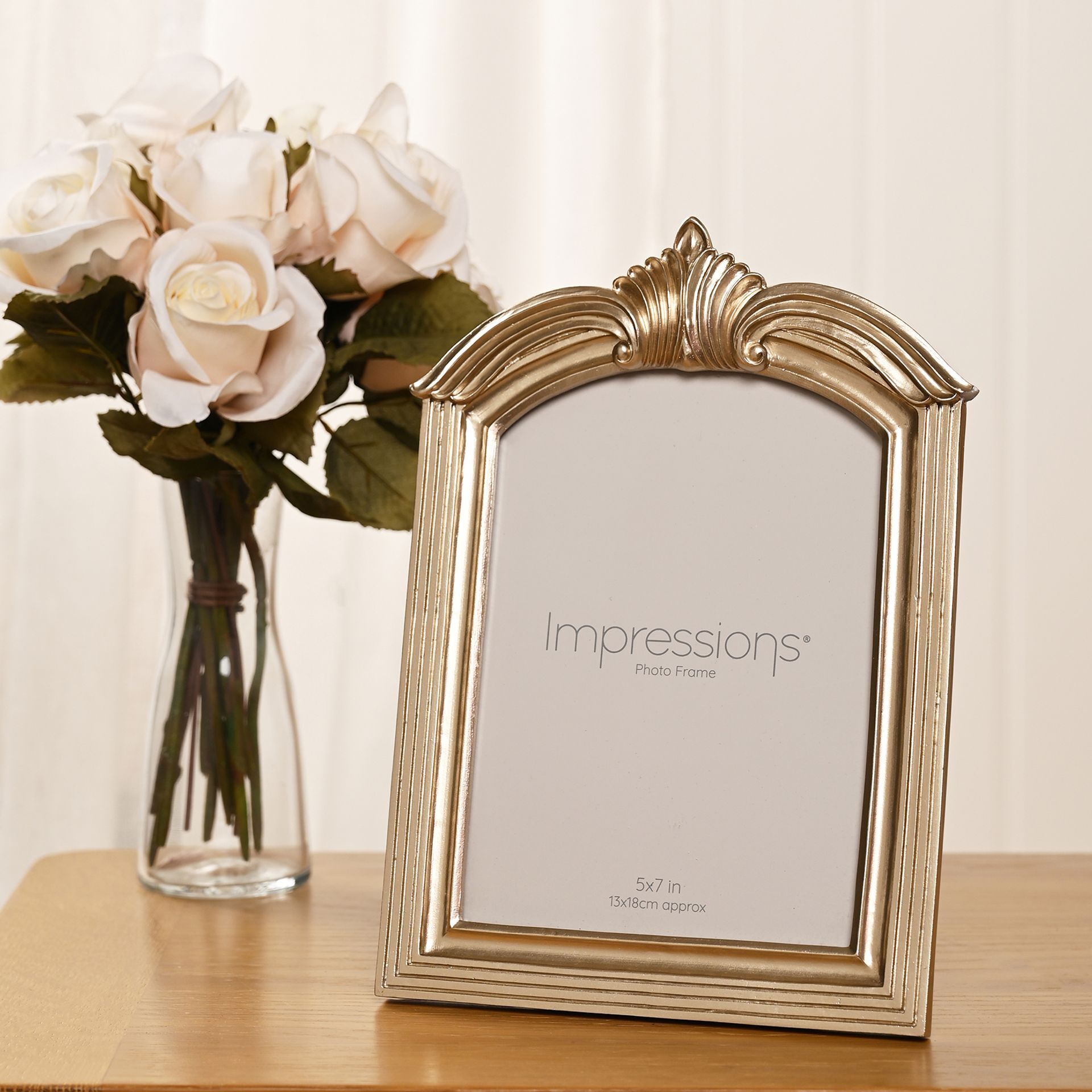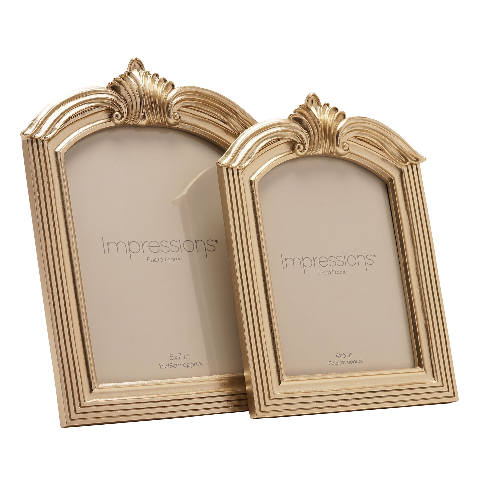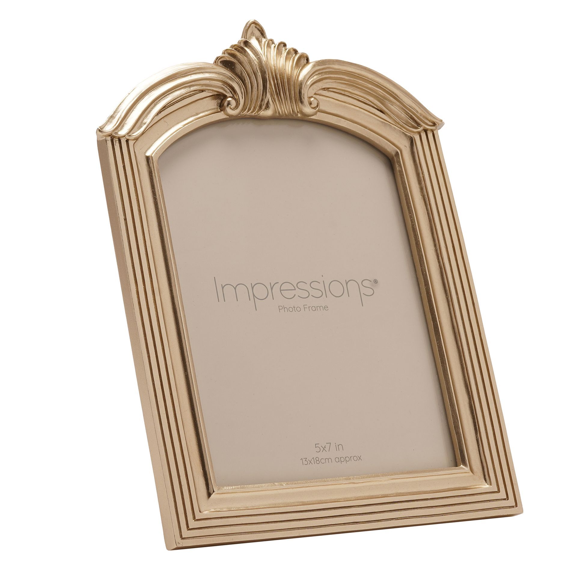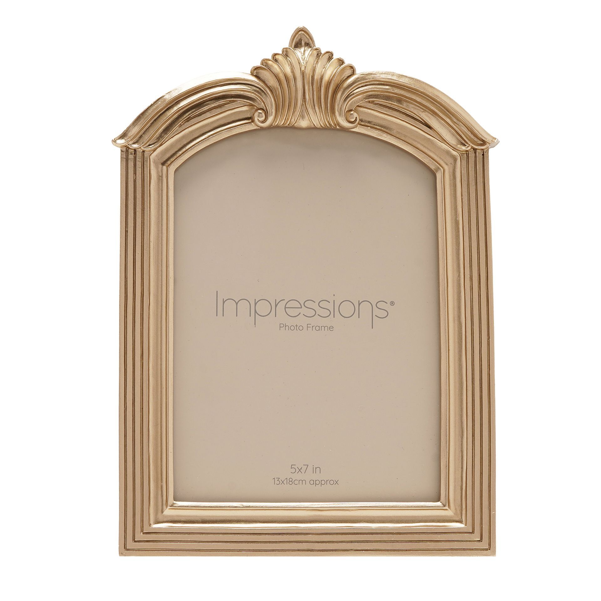The Impressions Champagne Gold Winged Arch Resin Photo Frame 5" x 7" offers an ornate and elegant way to display treasured photographs. Featuring a champagne gold finish with a decorative winged crest and arched silhouette, it brings a classic, heritage-inspired look to any interior.