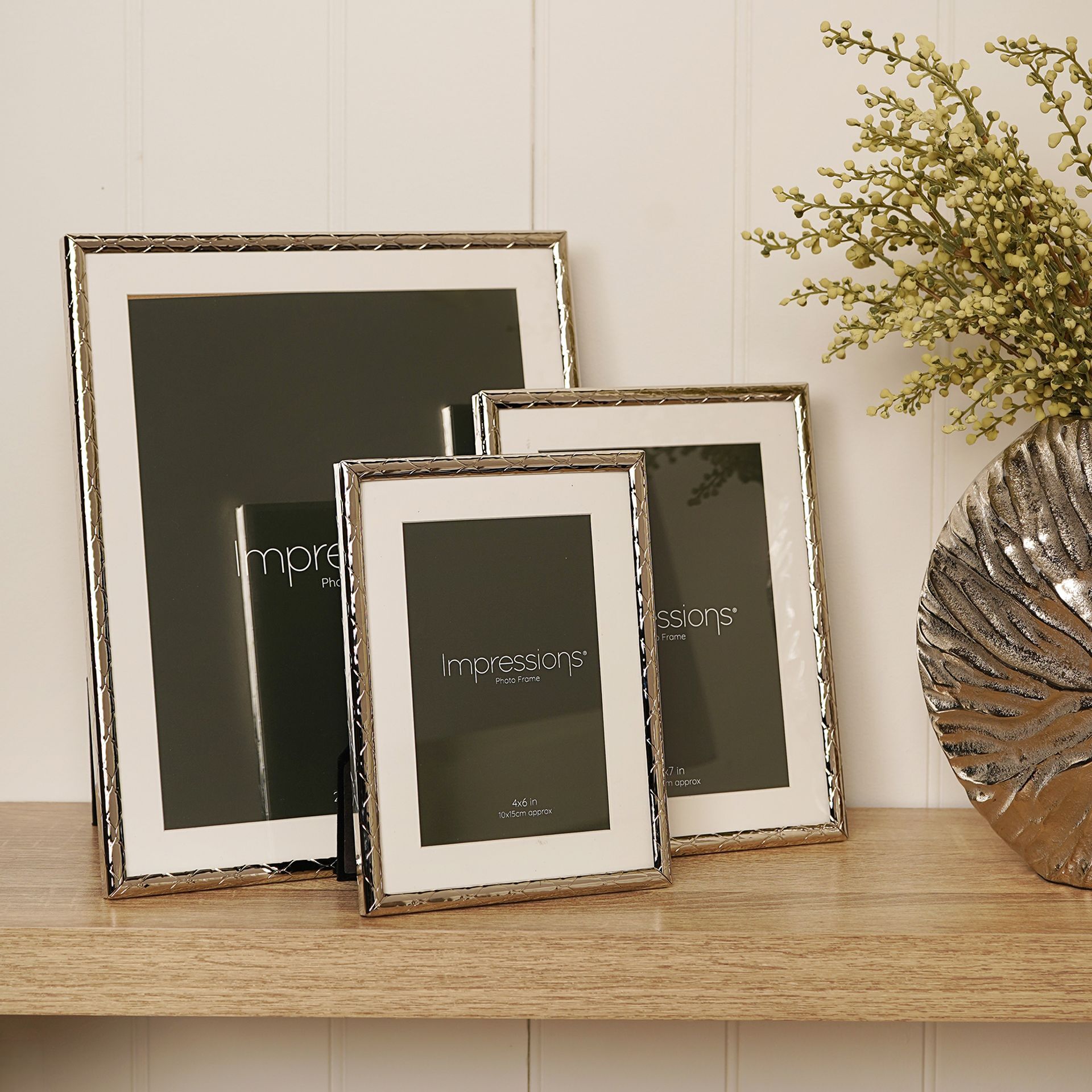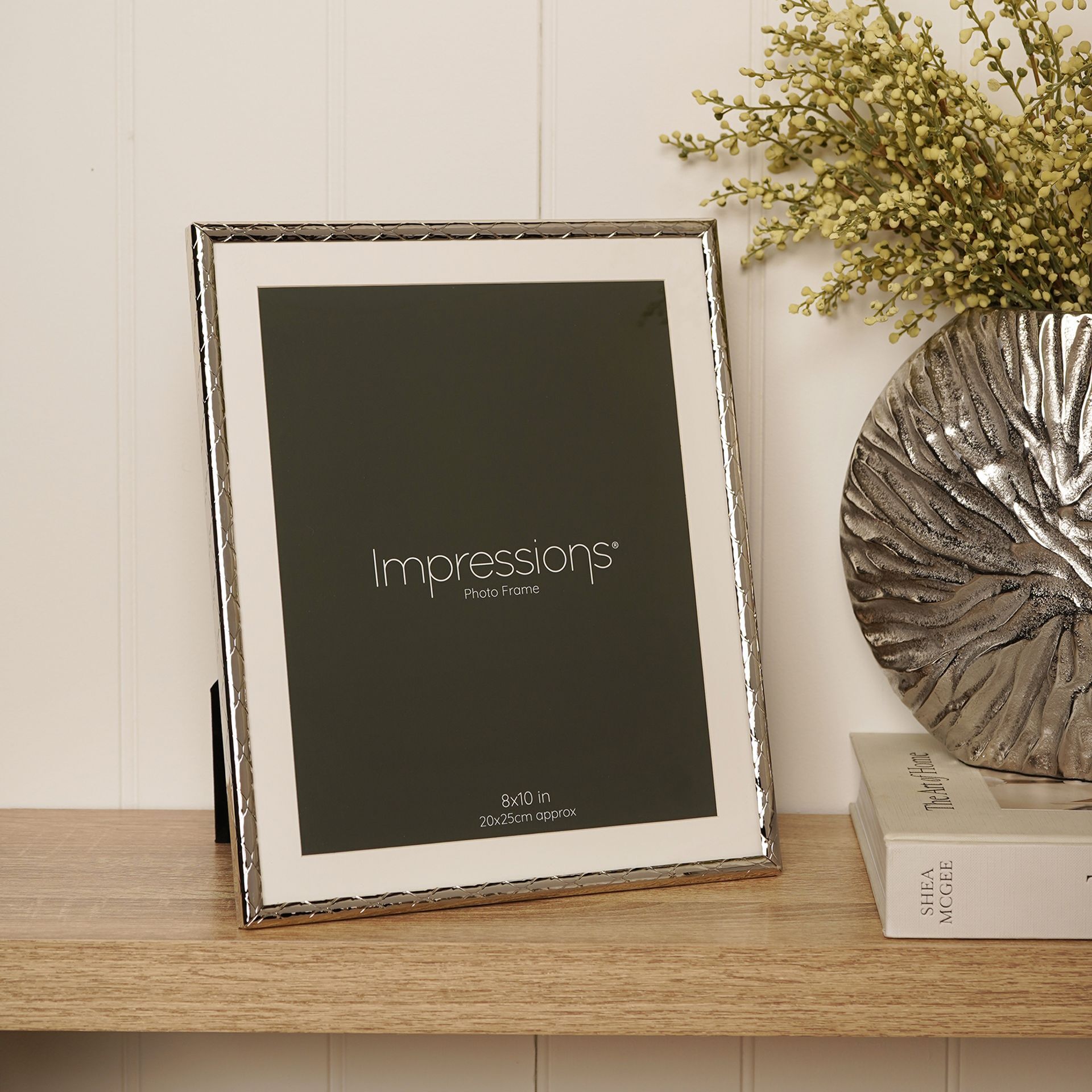The Impressions Criss Cross Silver Photo Frame 8" x 10" offers a contemporary way to display treasured photographs. Featuring a polished silver finish with a subtle criss-cross textured border, it adds depth and detail while maintaining a clean, modern look.
