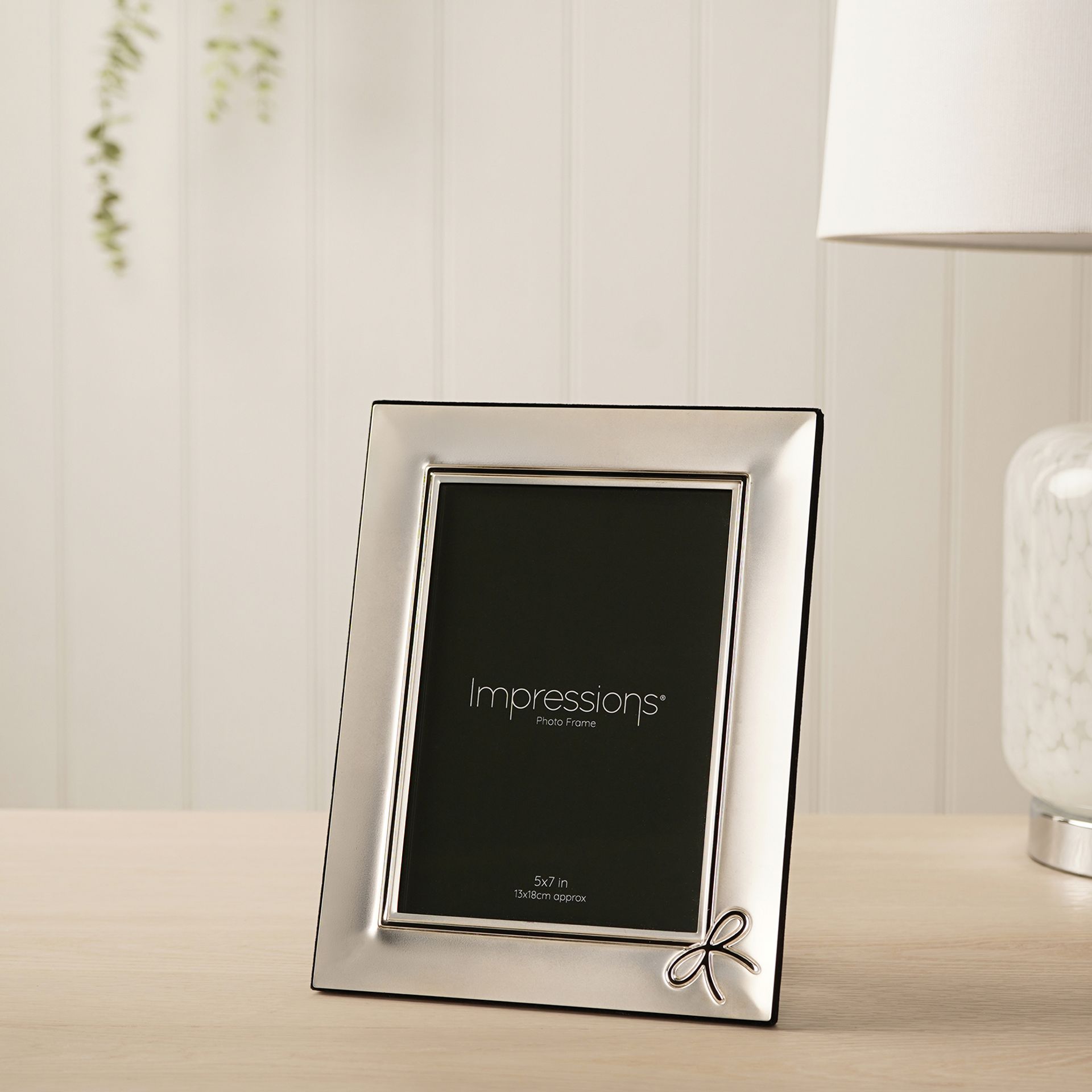 The Impressions Silver Plated Bow Photo Frame 5" x 7" offers a soft, decorative touch for displaying cherished photographs. Featuring a polished silver-plated finish with a delicate bow detail in the corner, it adds a subtle yet elegant accent to the overall design. Designed to hold a standard 5" x 7" image, the frame combines clean lines with a gentle decorative feature, making it suitable for a variety of interiors. The reflective finish enhances the presentation, drawing attention to the photo within. Part of the Impressions collection, this frame is ideal for gifting on special occasions or for adding a refined, feminine touch to shelves, desks or bedside tables.