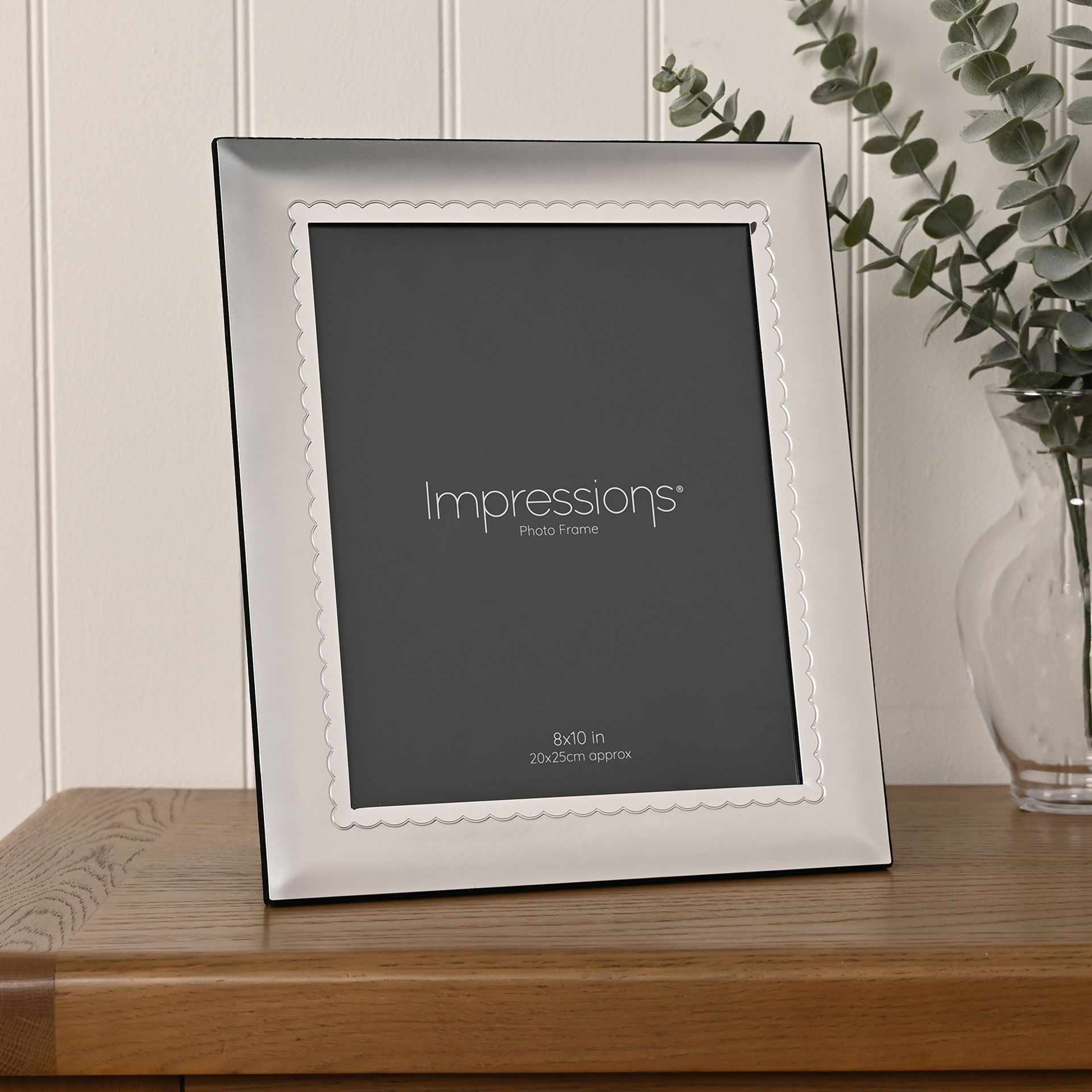 The Impressions Silver Plated Scalloped Photo Frame 8" x 10" offers a decorative way to showcase cherished photographs. Featuring a polished silver-plated finish with a delicate scalloped inner border, it adds subtle detail while maintaining a clean, elegant look.