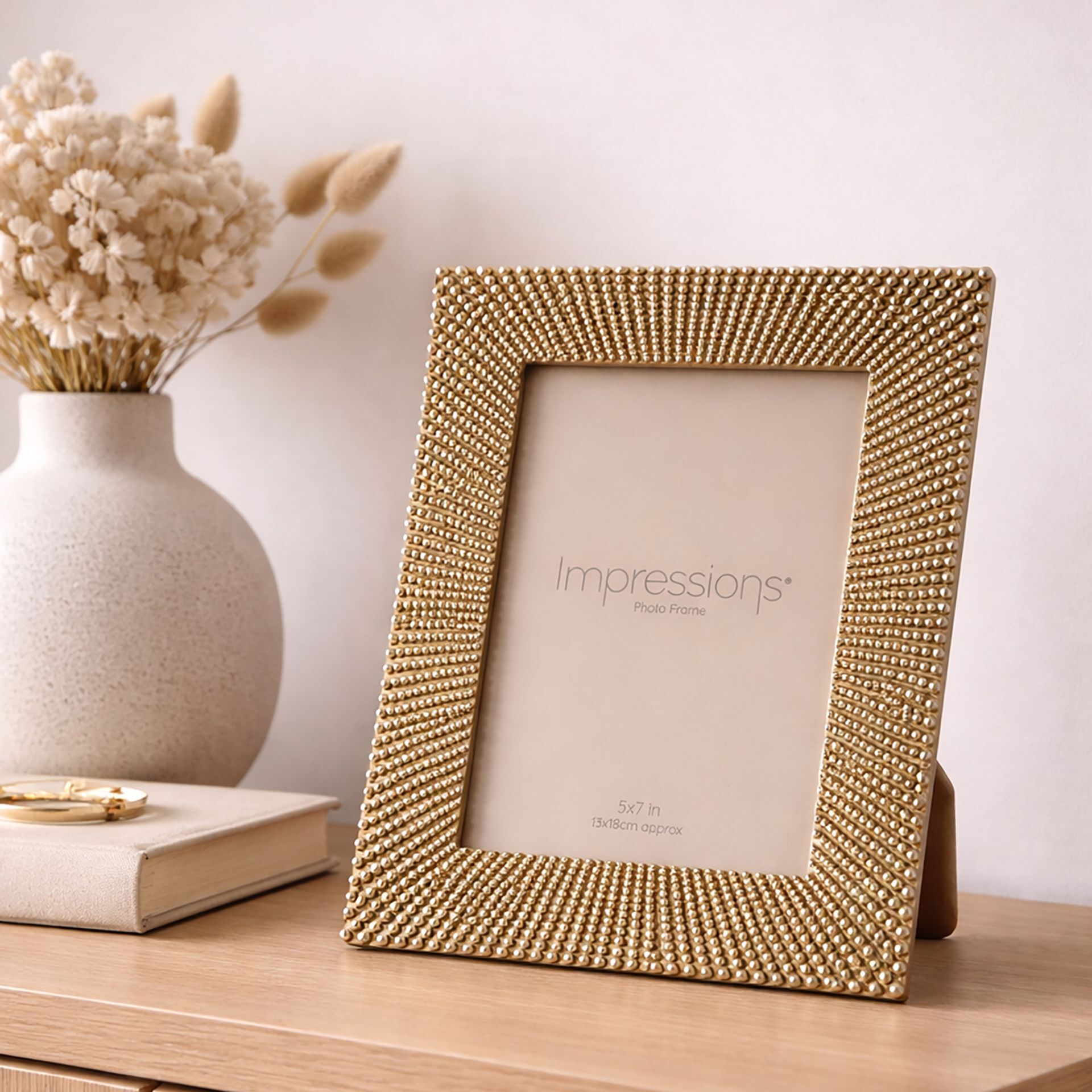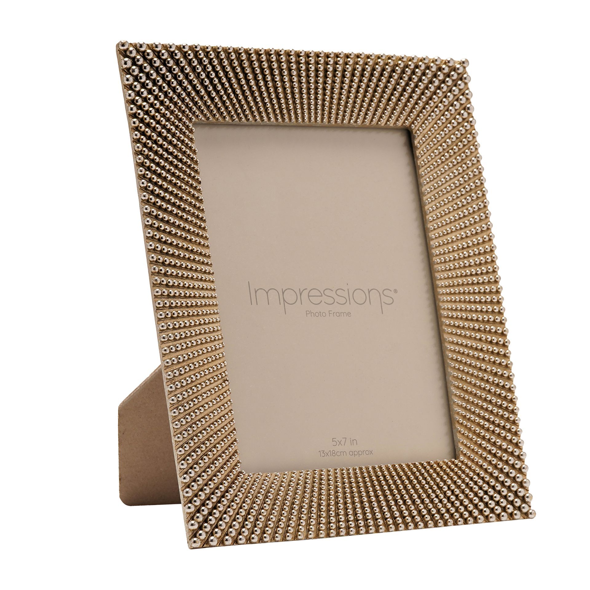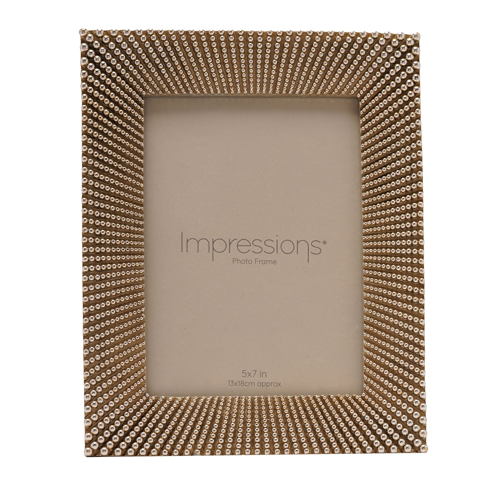 The Impressions Sunburst Beaded Champagne Resin Photo Frame 5" x 7" offers a bold and decorative way to display cherished photographs. Featuring a champagne-toned finish with a detailed beaded sunburst design, it creates a striking focal point that adds texture and warmth to any space. Designed to hold a standard 5" x 7" image, the frame’s layered, radiating pattern enhances the presentation while complementing both contemporary and classic interiors. The rich finish brings a touch of luxury, making it ideal for standout displays. Part of the Impressions collection, this frame is perfect for gifting or for adding a statement piece to shelves, desks or mantelpieces.