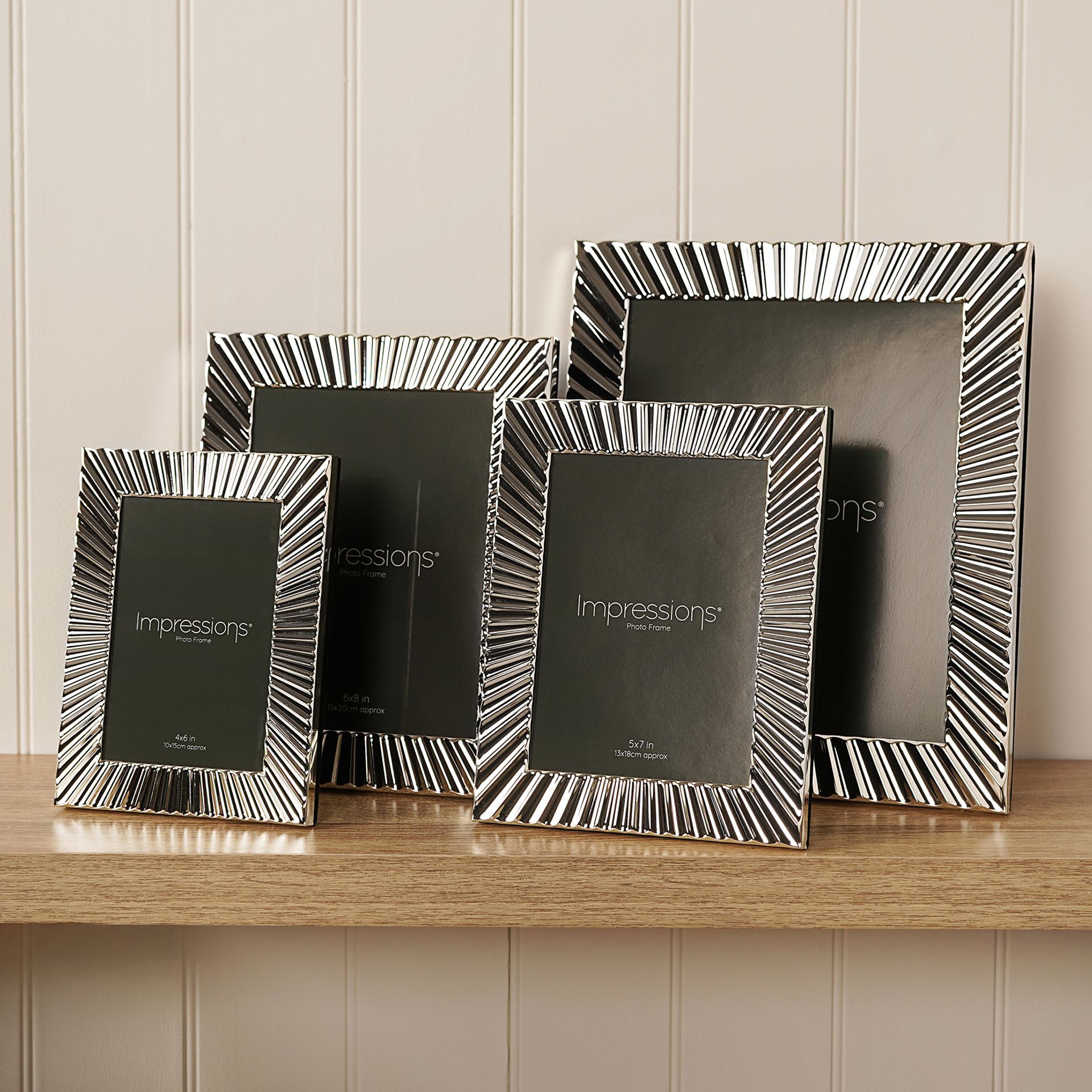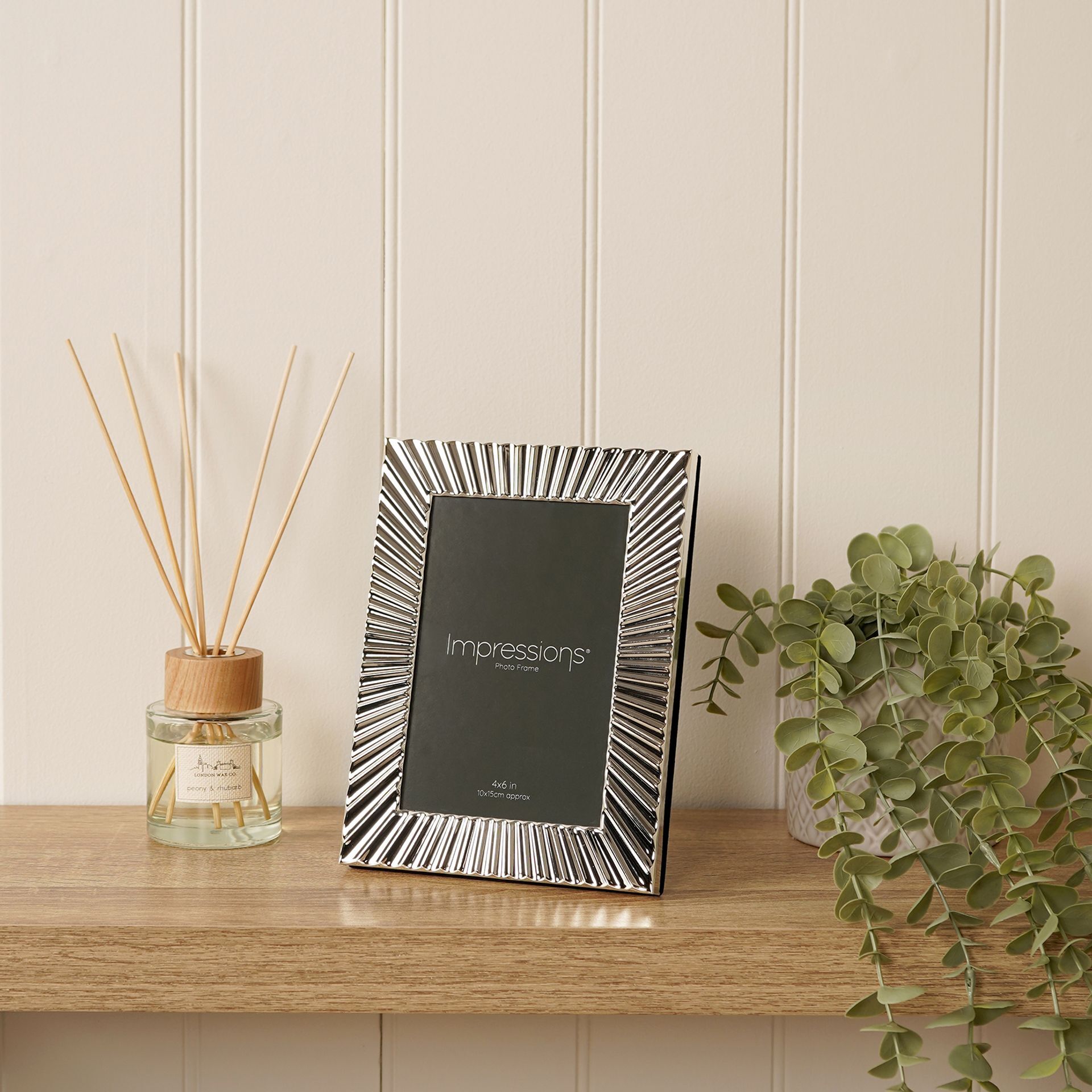 The Impressions Sunburst Silver Photo Frame 4" x 6" offers a bold and contemporary way to display treasured photographs. Featuring a polished silver finish with a striking radiating sunburst design, it creates depth and texture while adding a statement look to any space.