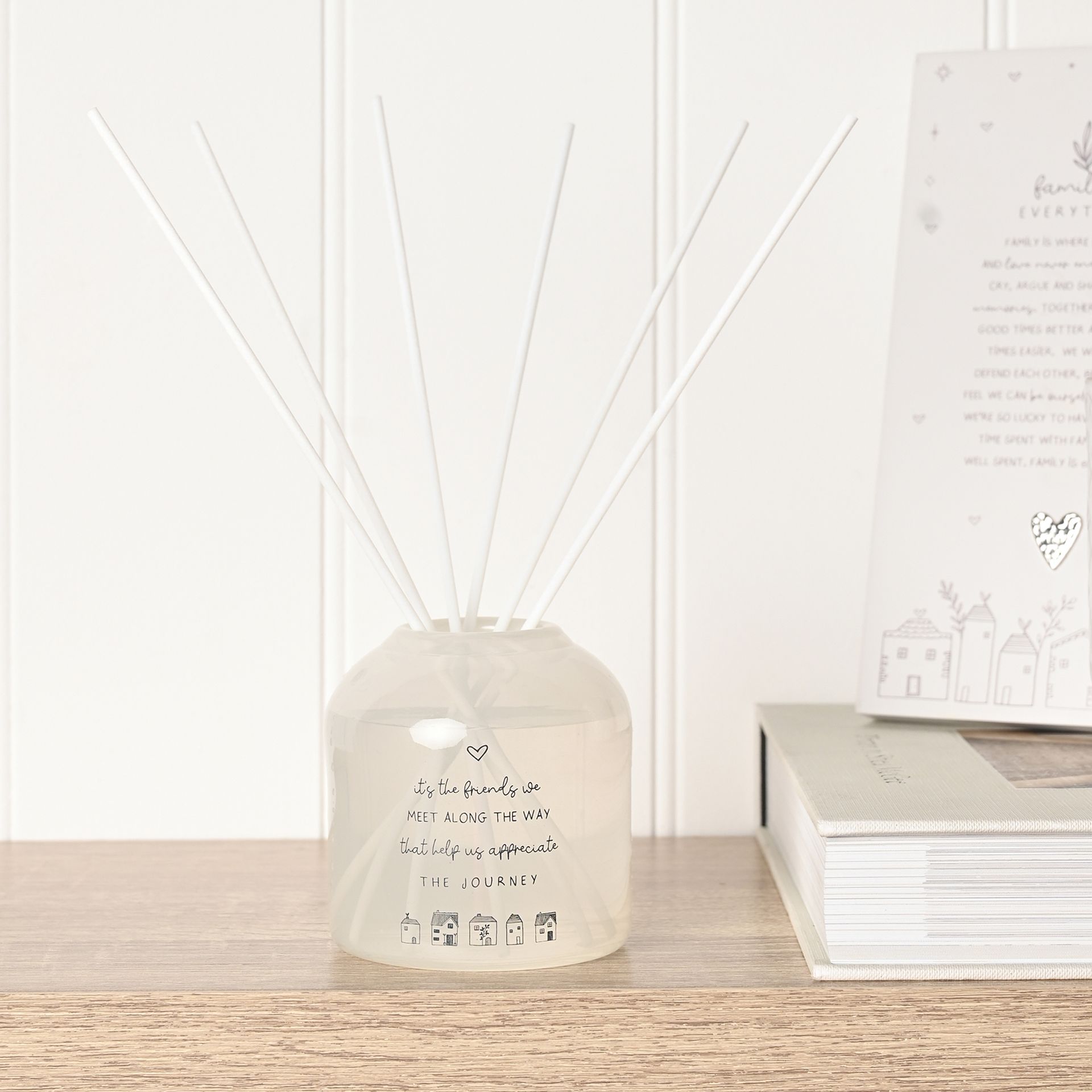 A beautifully presented glass diffuser featuring a heartfelt sentiment celebrating friendship, complemented by delicate illustrated detailing. Finished in soft neutral tones, it brings a warm and meaningful touch to any space.