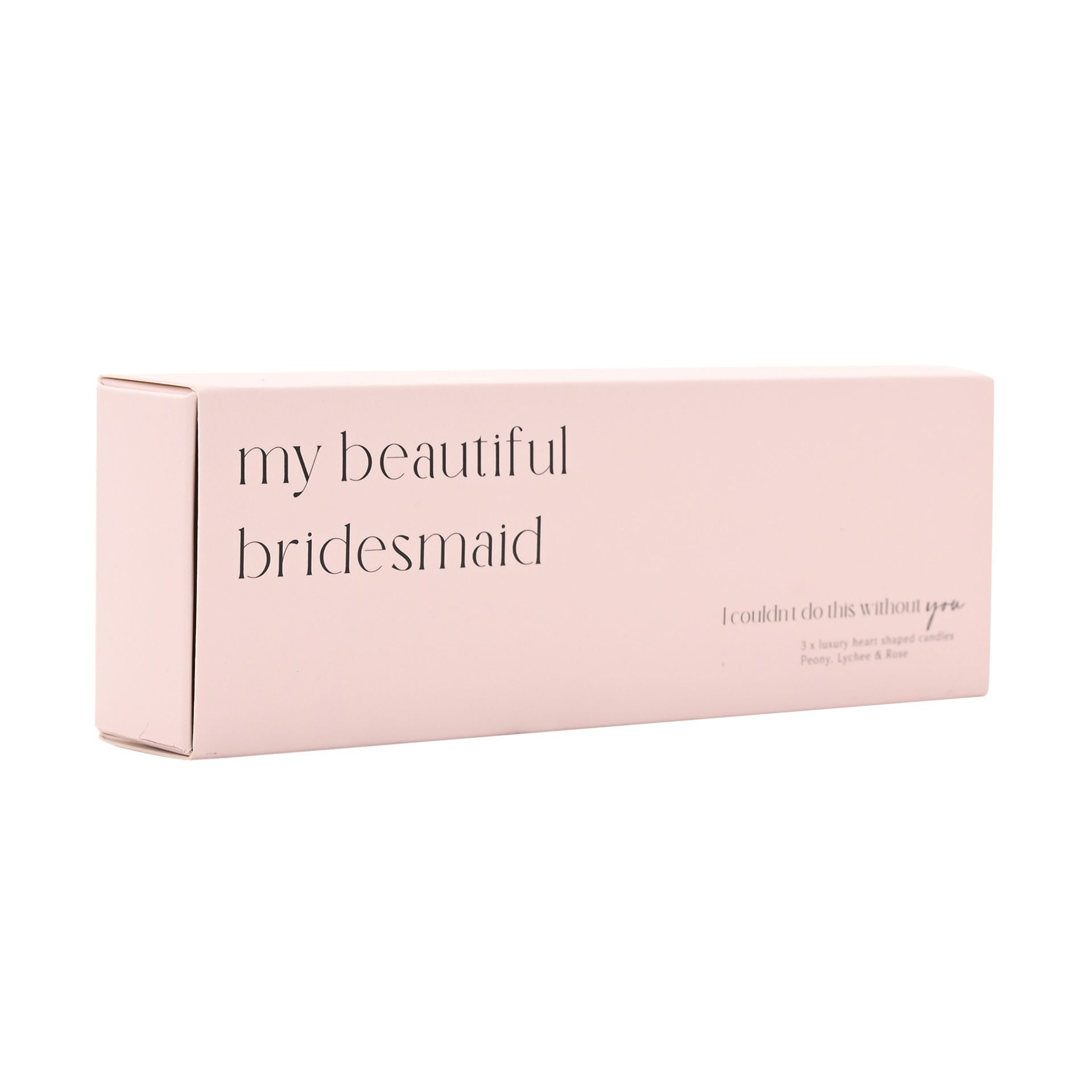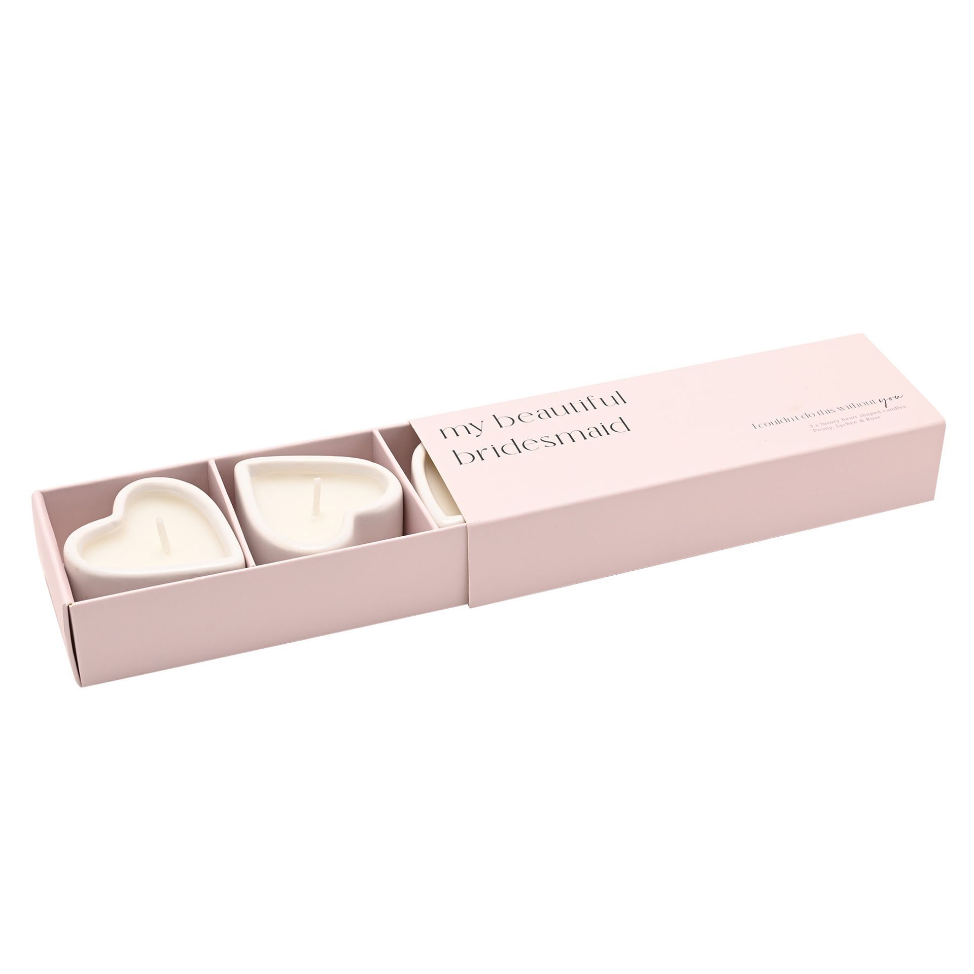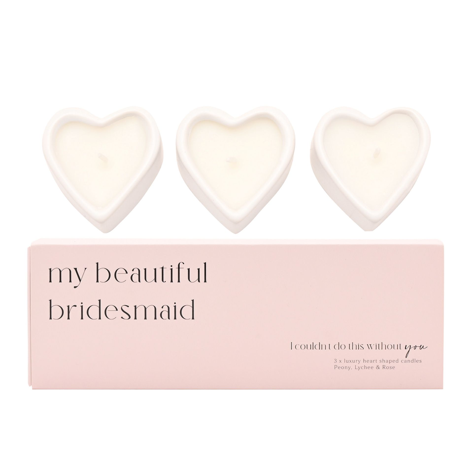 Three white ceramic heart-shaped candles are presented in an elegant slide-out box featuring the text "I couldn't do this without you", creating a meaningful keepsake to mark a special day. With a Peony, Lychee and Rose scent.