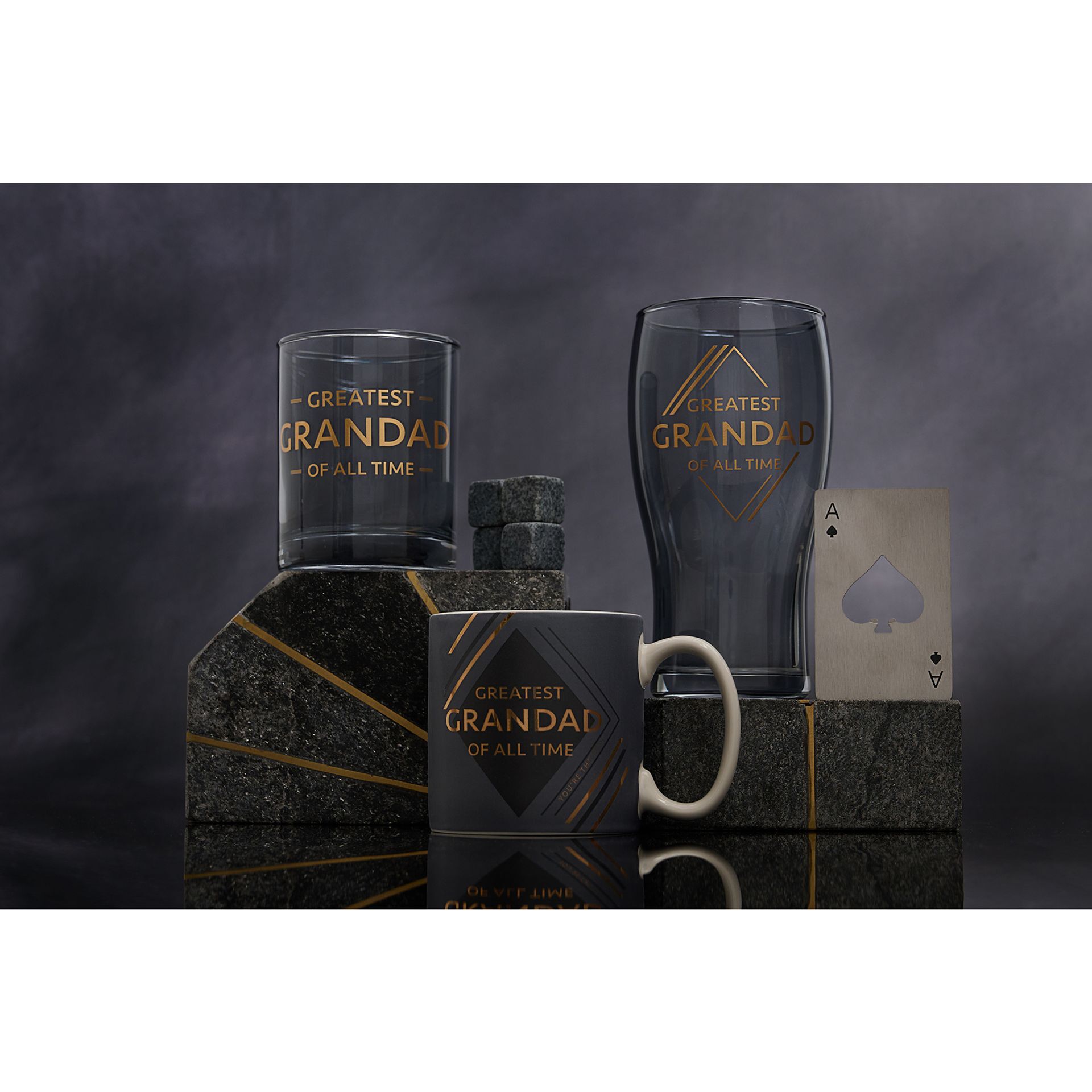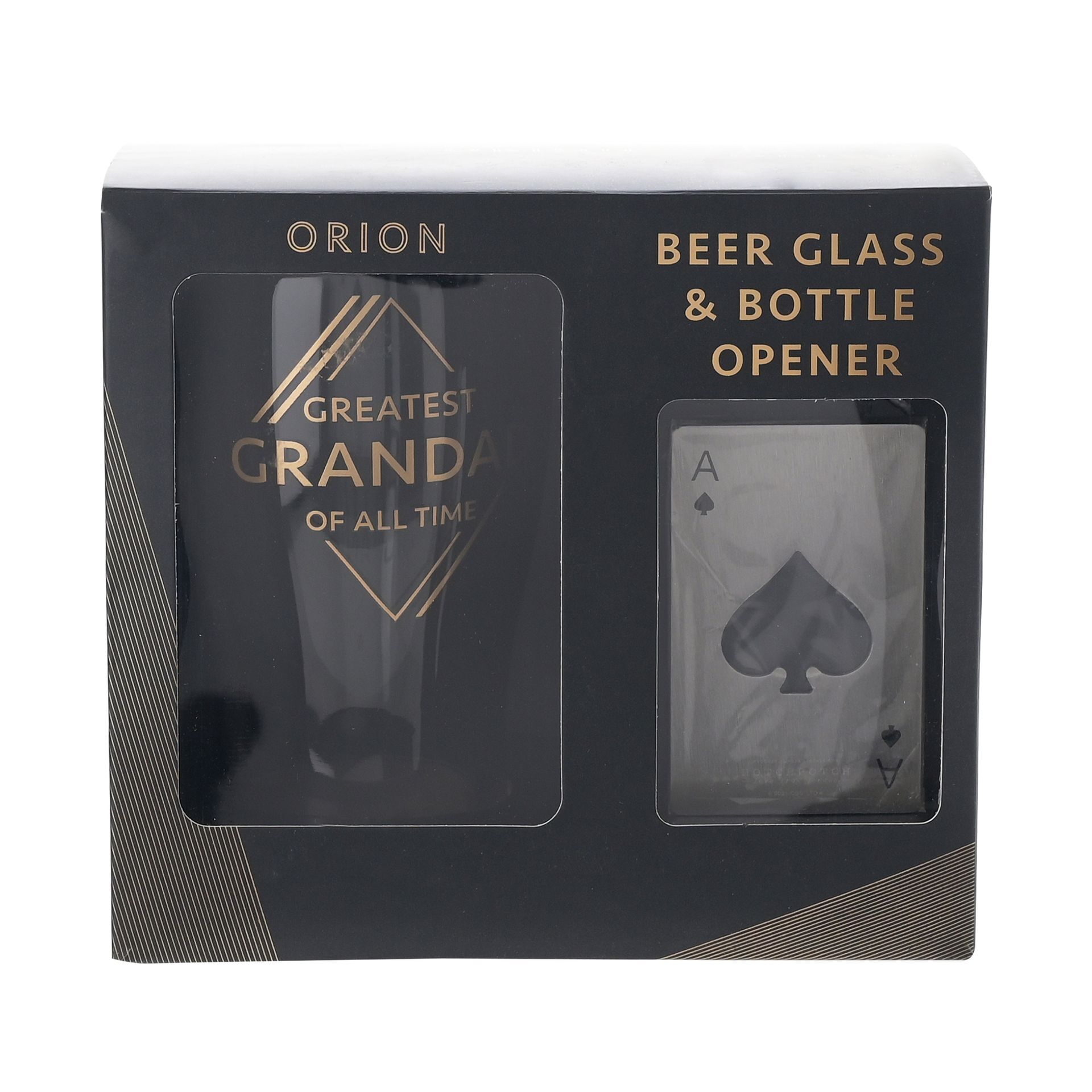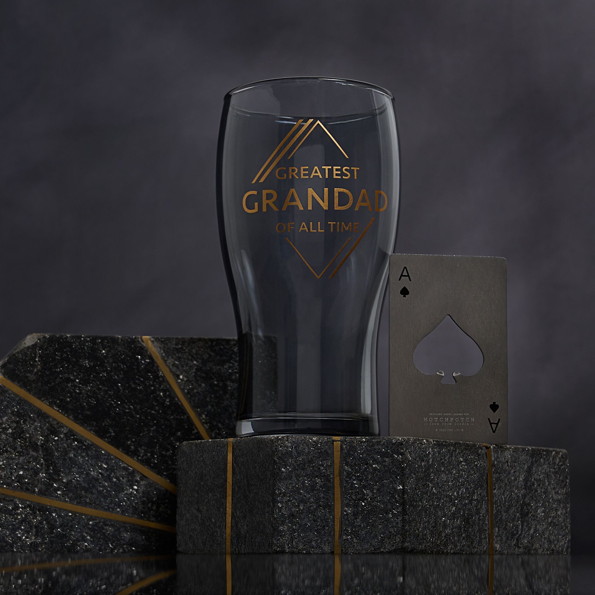 The pint glass features blue tinted glass, complete with ‘Greatest Grandad of All Time’ gold title. It is accompanied by a metal, wallet sized ‘ace of spades’ bottle opener, ensuring that Grandad is always able to use his glass.