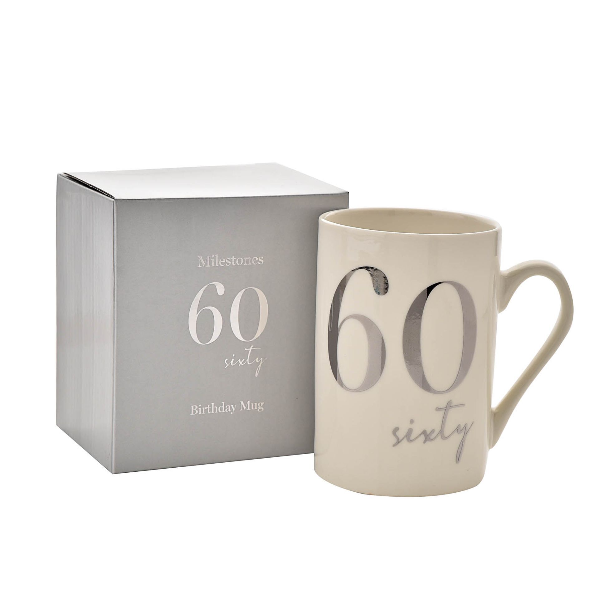 Help someone special toast 60 years in style with this crisp white porcelain mug with silver foil decal. Details: - Crisp white porcelain mug - 310ml volume - Silver foil 60 - SIXTY decal - Window gift box - Not suitable for dishwasher or microwave