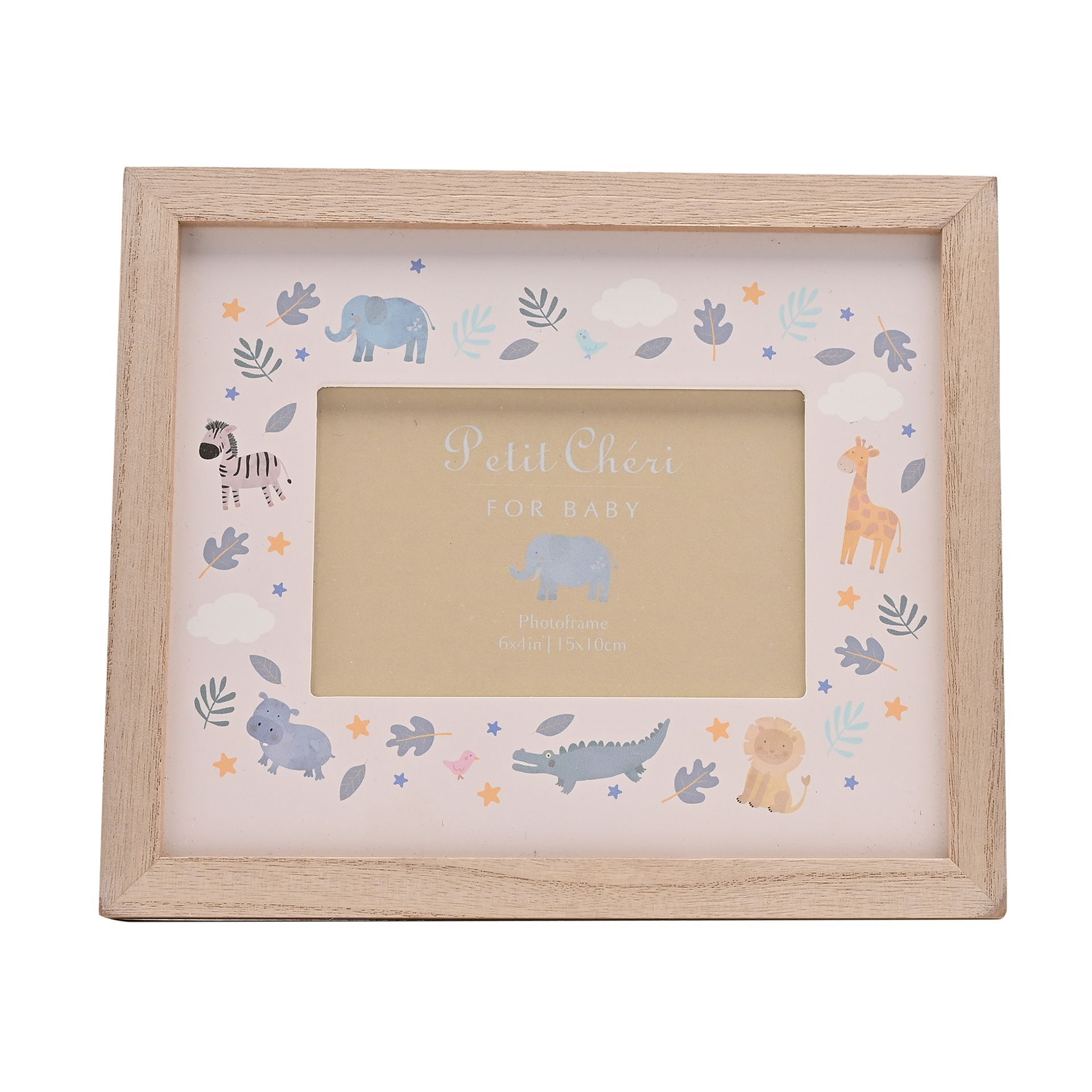 Add a touch of charm to your home with the Petit Cheri Animal Border Frame. This delightfully designed wooden frame, with its pastel-coloured animal silhouettes and floral patterns, provides the perfect setting for your cherished 6" x 4" photograph.