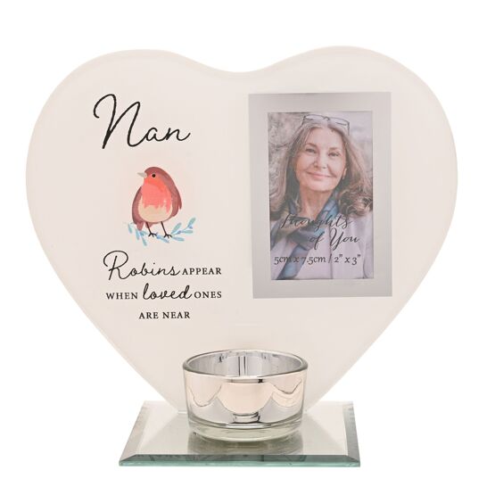 A heart-shaped frame rests on a mirrored base with a glass tealight holder positioned in front, creating a gentle focal point for remembrance. To the left of the heart, the sentiment reads ‘Thinking of you’, accompanied by a delicate robin illustration and the heartfelt words ‘Robins appear when loved ones are near’. To the right is a space to add a treasured photograph, allowing this piece to become a personal tribute.