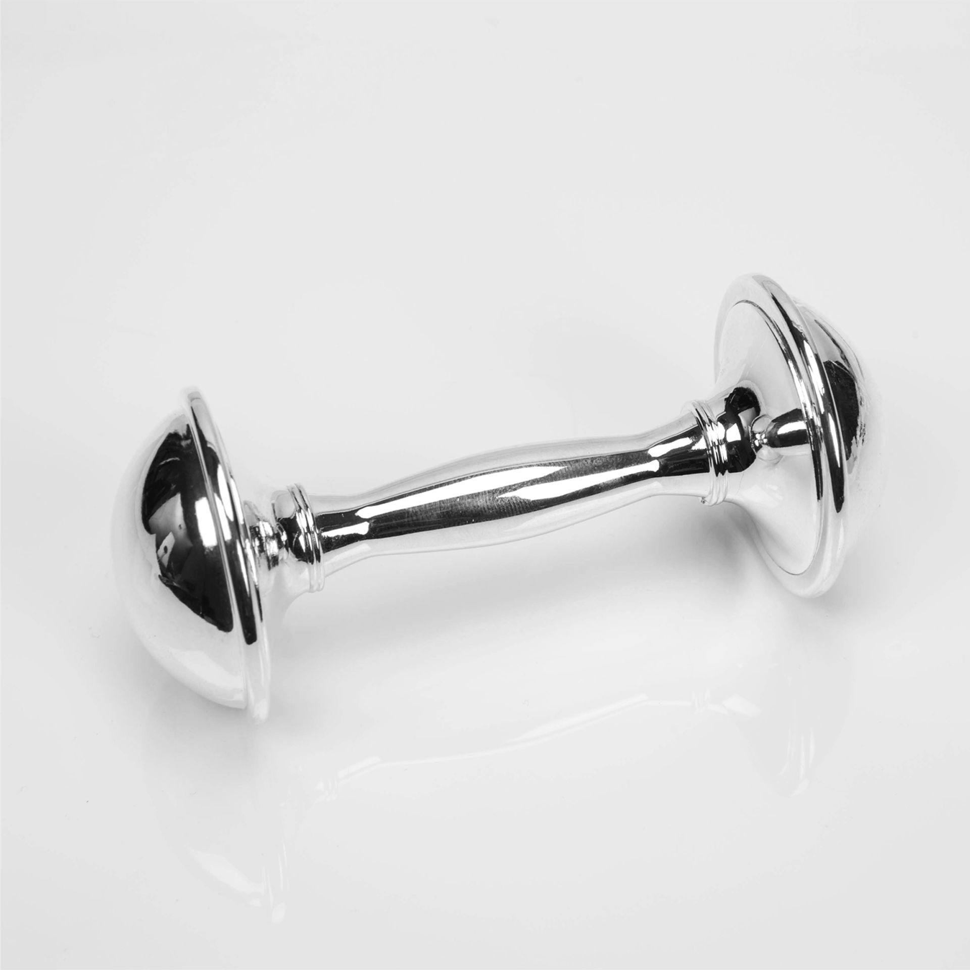 - Classic dumbell shaped baby rattle with domed ends and curved bar