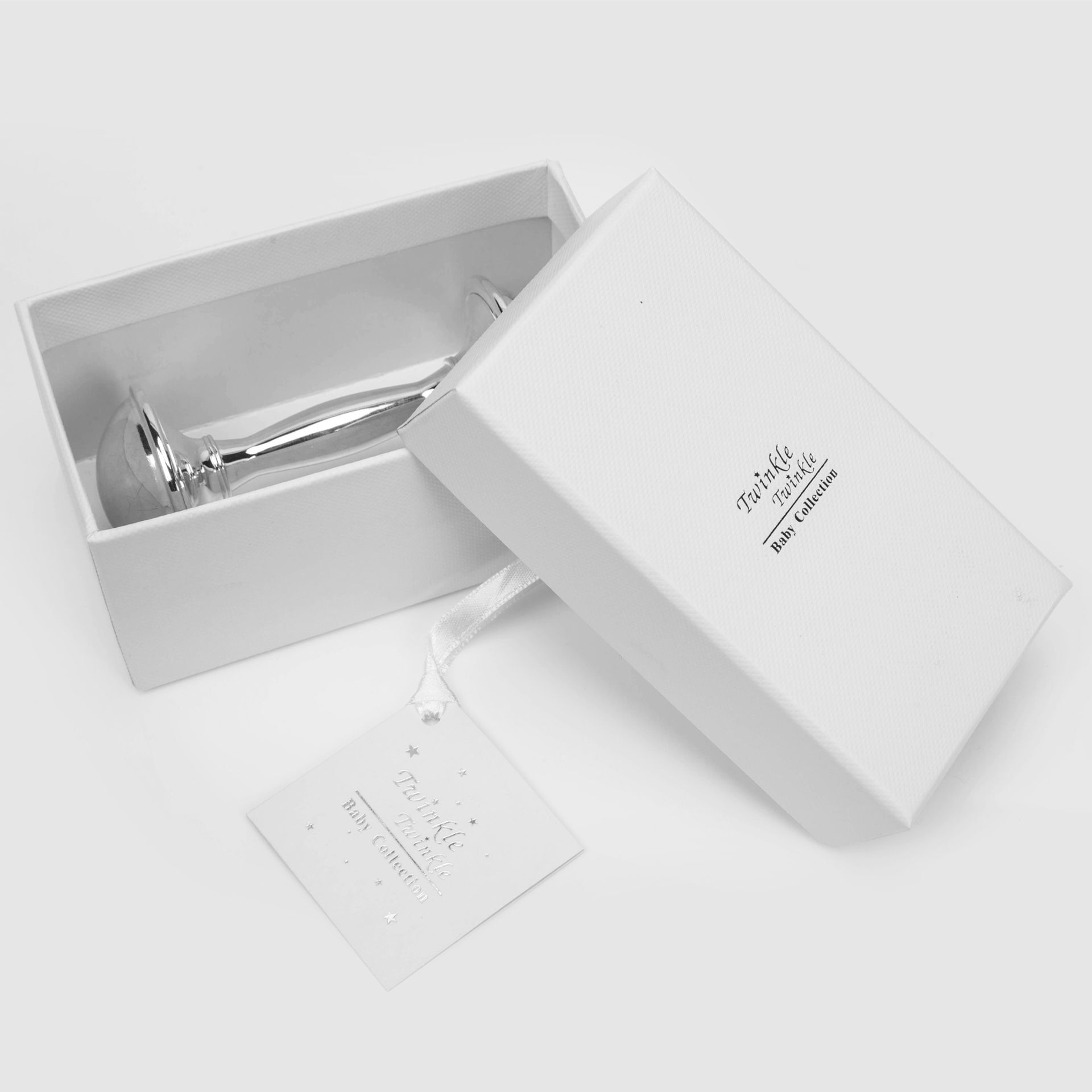 A beautiful silver-plated baby rattle with luxury gift box - soothing, gentle and calm - perfect giftware for a precious new arrival.