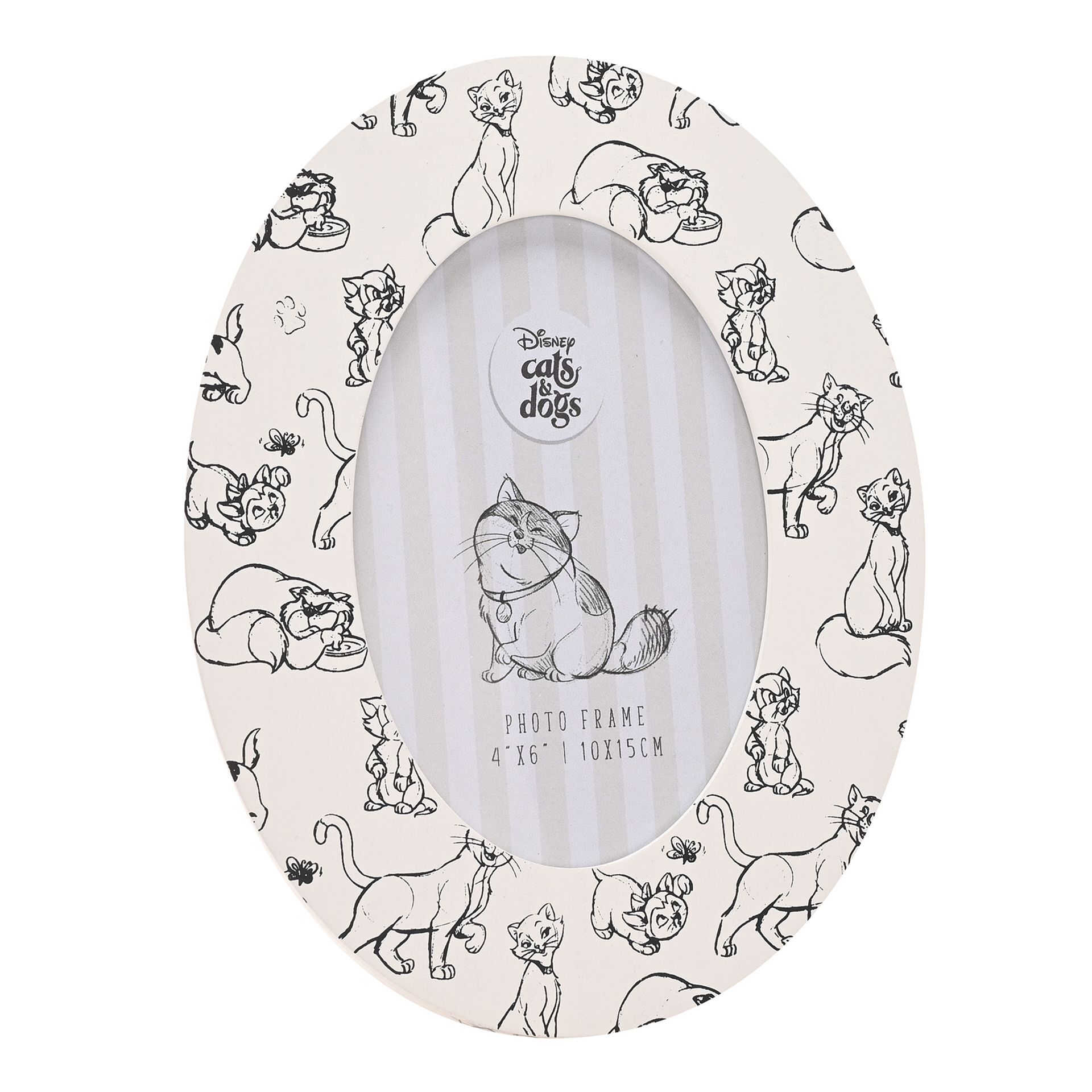The Disney Cats & Dogs Cat Print Oval Photo Frame 4" x 6" is adorned with black and white sketches of beloved Disney cat characters.