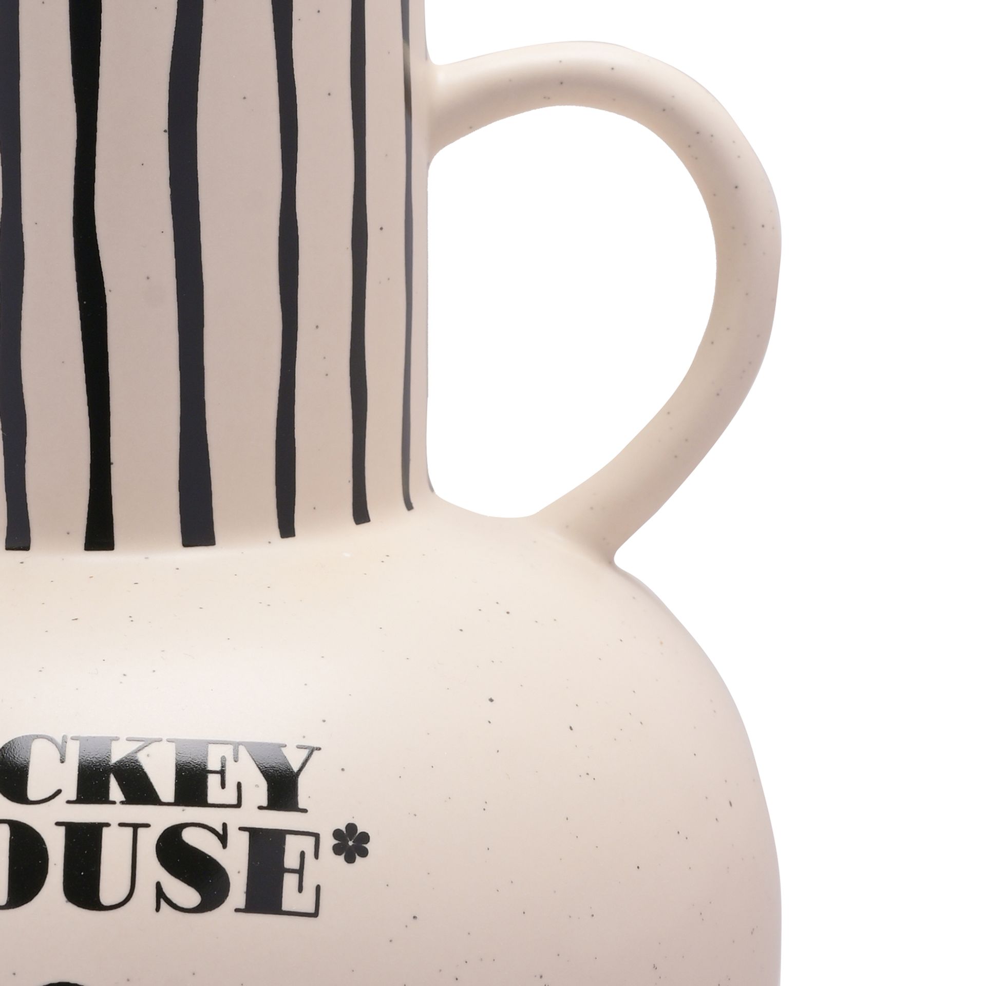 The white, ceramic amphora style vase showcases a printed Mickey Mouse illustration on either side, complete with ‘Mickey Mouse’ title, speckled design, striped neck and two large handles. It offers a large opening in which to display beautiful flower arrangements.