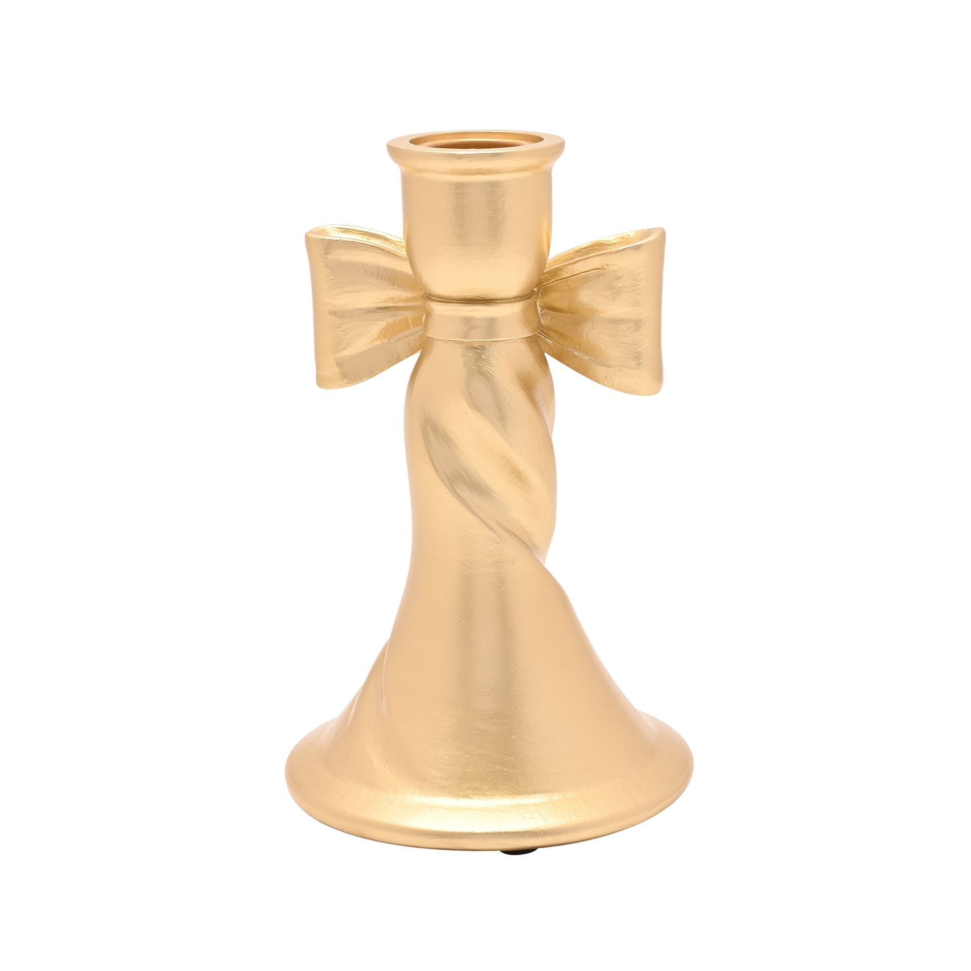 The Hestia Gold Ribbon Tall Taper Candle Holder is a striking design that adds sophistication to any room. The golden base is adorned with an elegant bow-like decoration, creating a charming contrast against the clean lines of the holder.