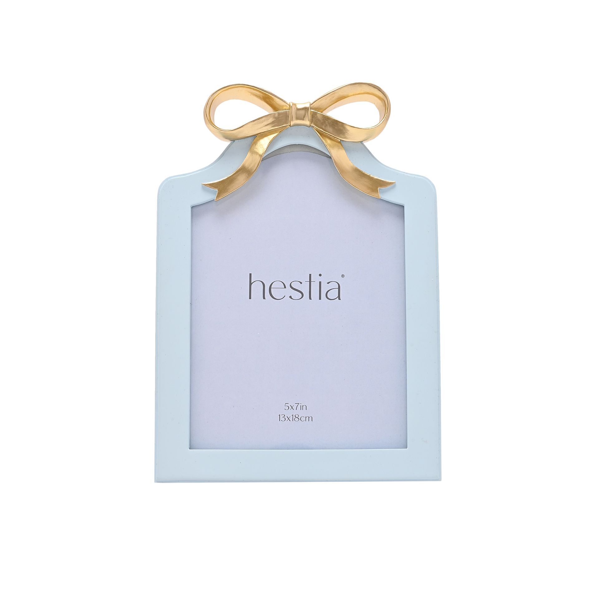 The Hestia Soft Blue with Gold Ribbon Photo Frame, with its delicate light blue hue paired with a charming golden bow decoration, exudes elegance. Making it a perfect keepsake or gift.