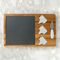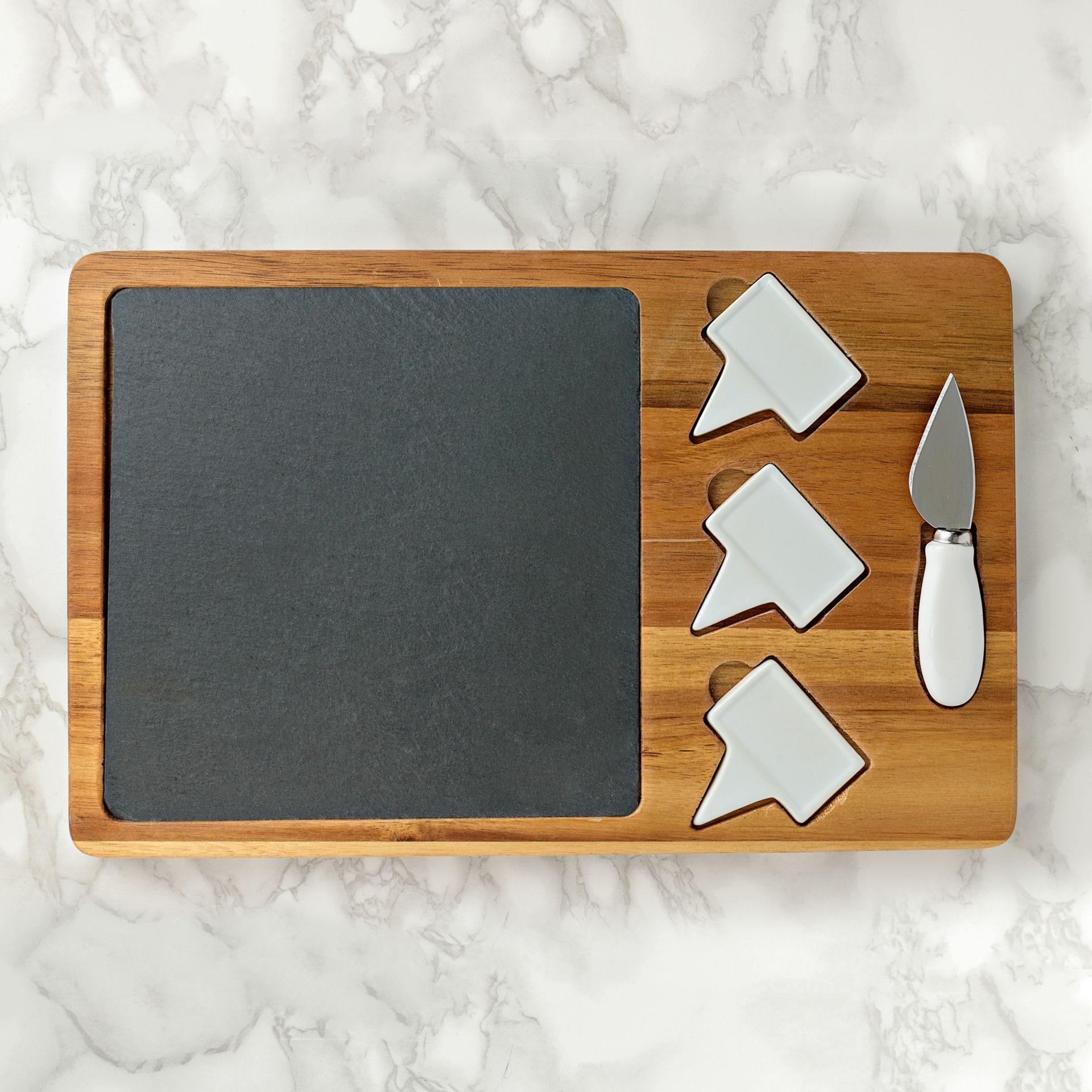 - 6 piece set : Acacia wood and slate tray, single cheese knife, three white ceramic signs and one marker.