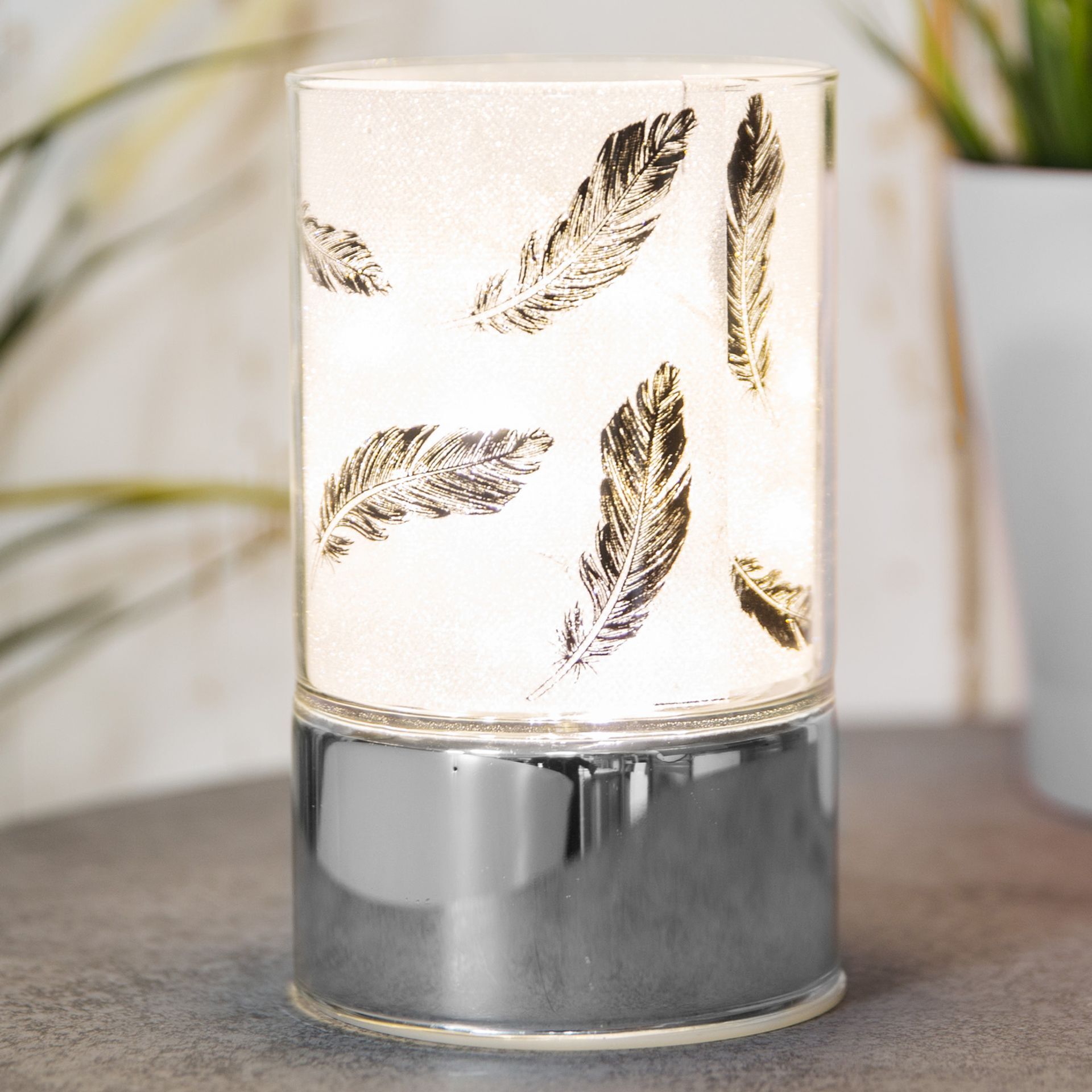 A stunning and elegant monochrome LED light tube from HESTIA®'s Silver Luxe collection. Featuring a glittering silver translucent insert with black feather details and a mirror finished base. Requires 3 x AA batteries for use.