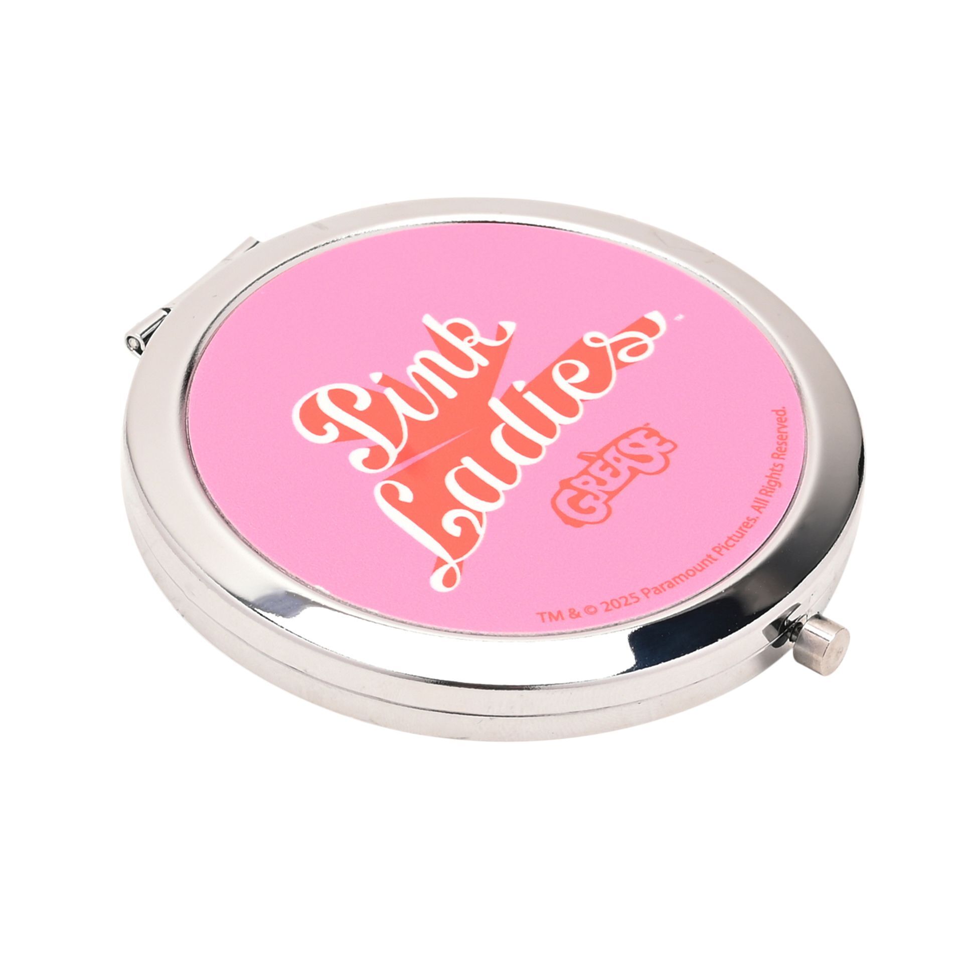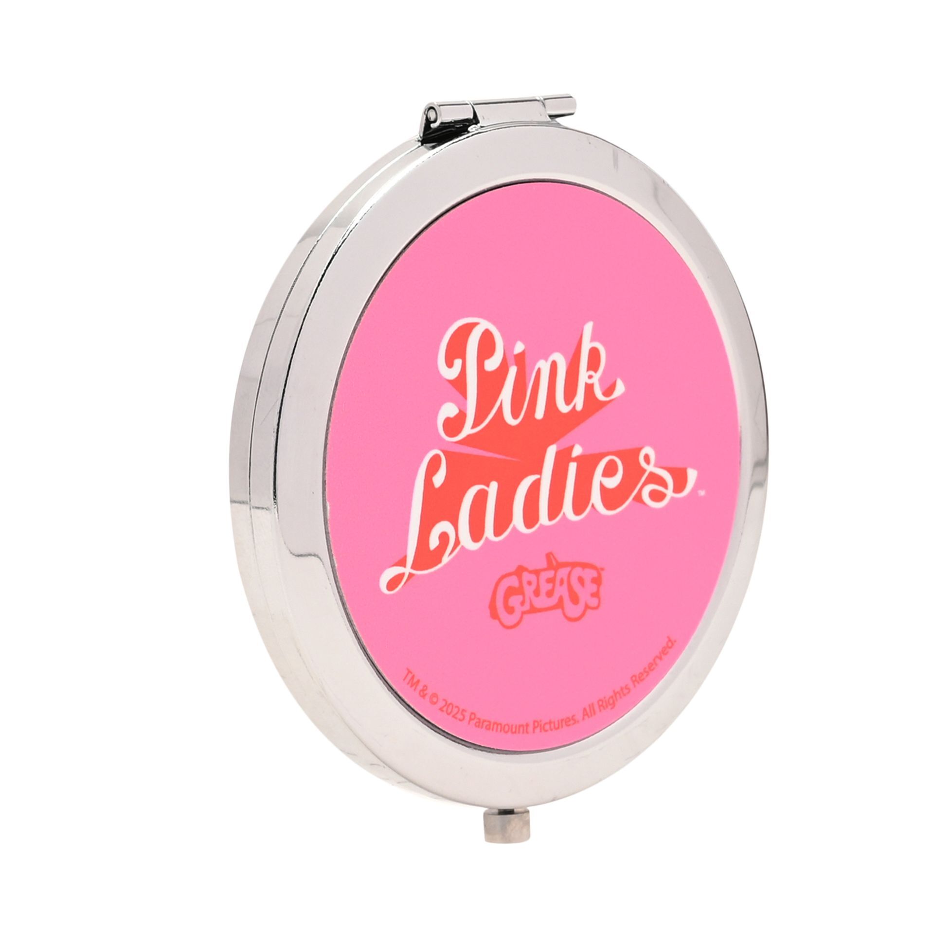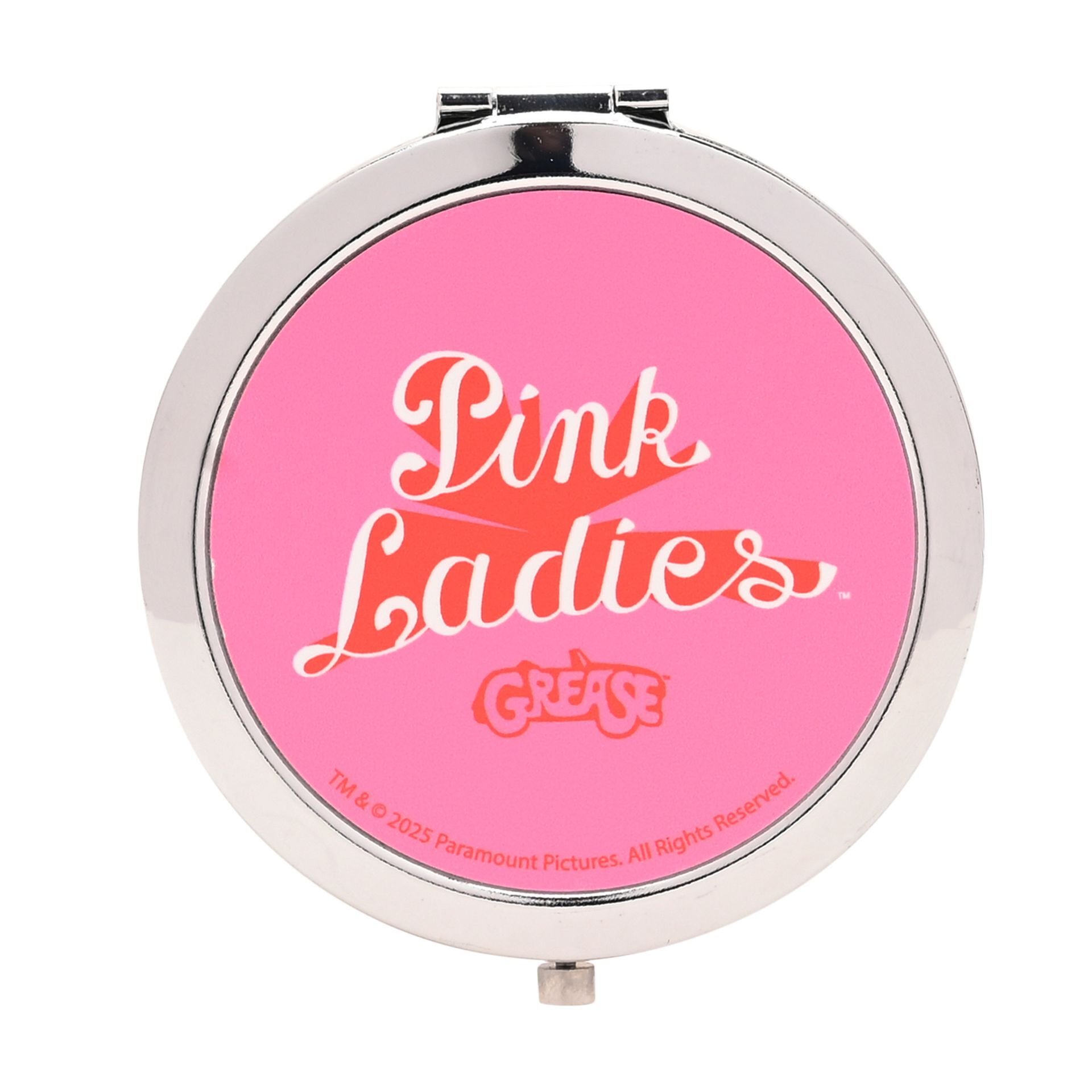 The Fandomania Grease 'Pink Ladies' Compact Mirror is a fun accessory for fans of the classic musical. Featuring the iconic Pink Ladies text, it combines retro style with everyday practicality.