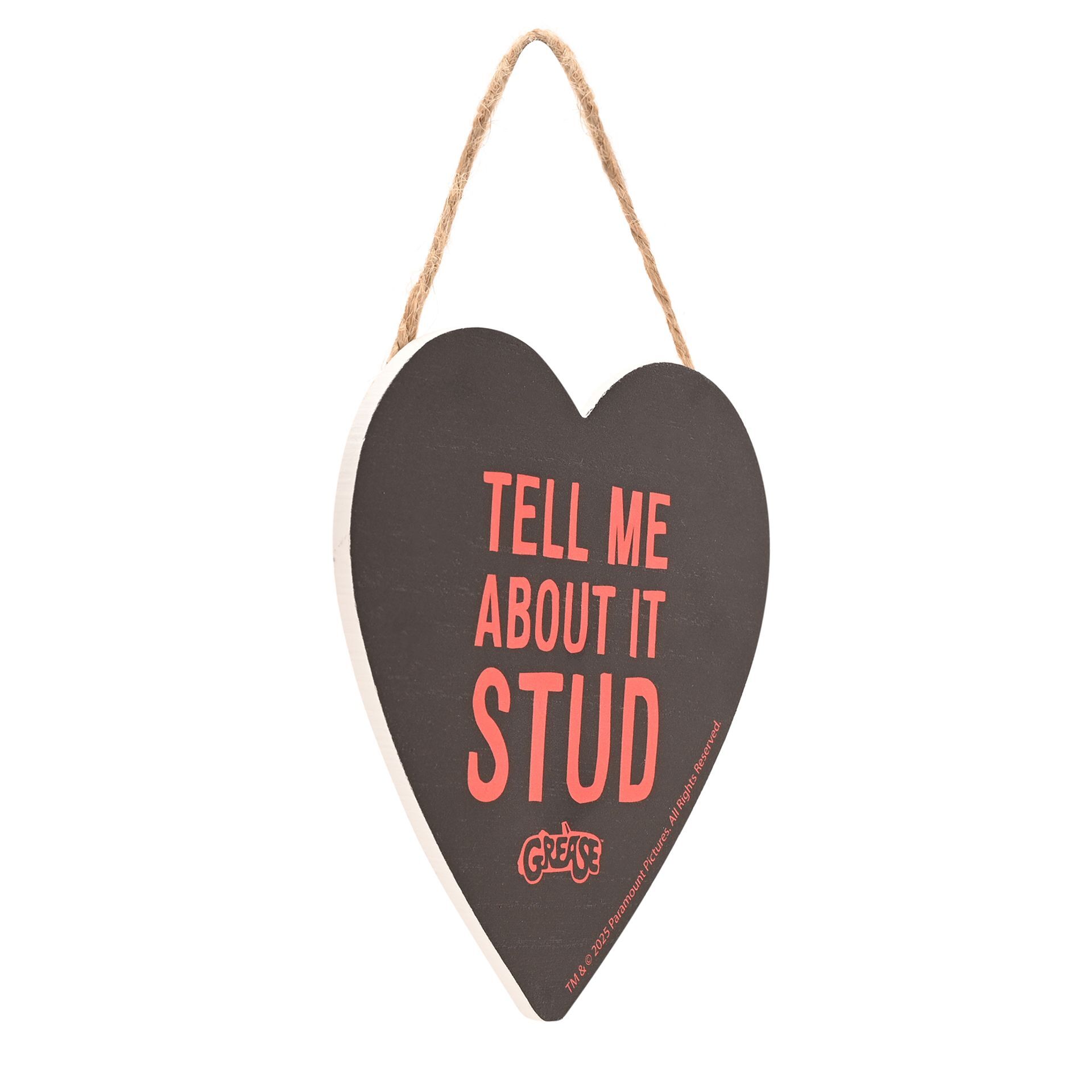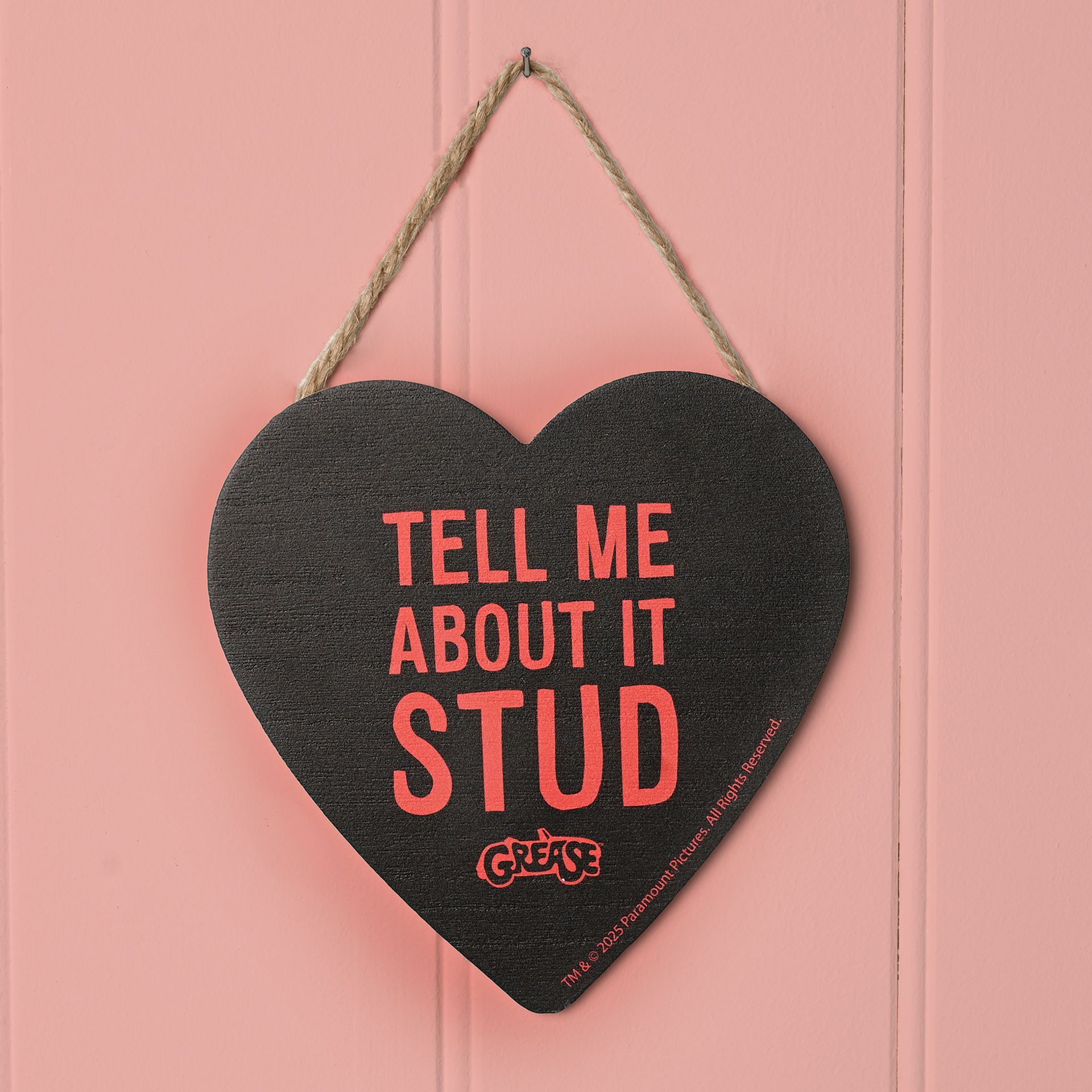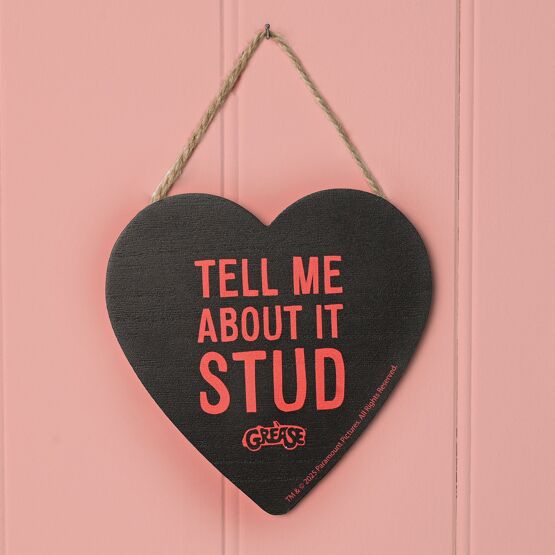 The Fandomania Grease 'Tell Me About It, Stud' Hanging Heart Plaque is a bold decorative piece for fans of the classic musical. Featuring the unforgettable quote, it brings instant retro appeal to walls, doors, or shelves.