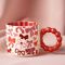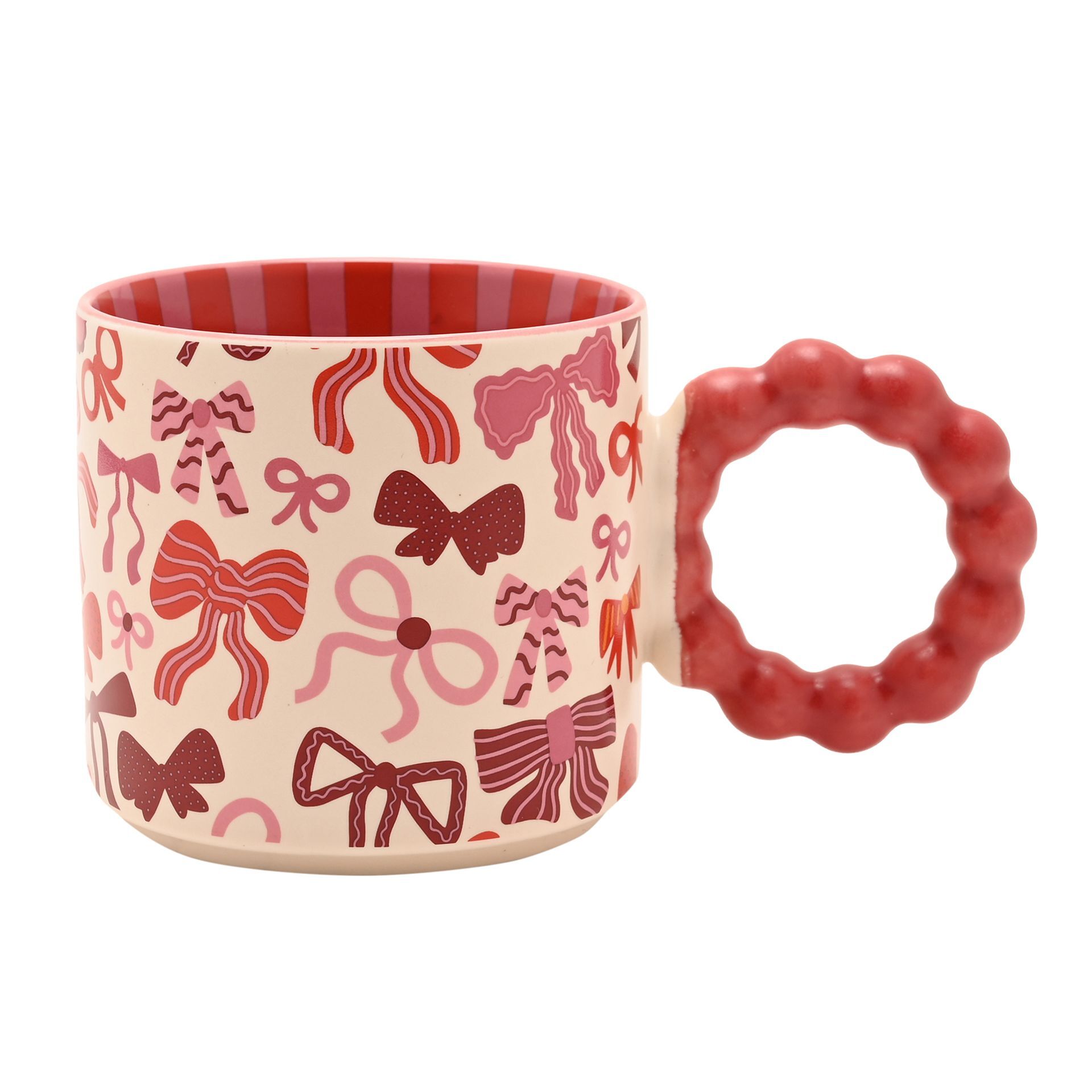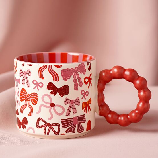 Adorned with a bold pattern of red bows and ribbons, this ceramic mug adds character to morning routines. The distinctive shaped handle makes it both practical and full of personality.