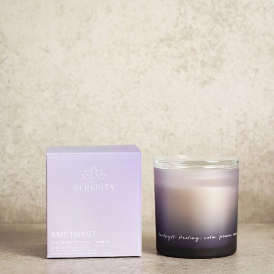 The Serenity Amethyst Crystal Infused 380g Candle creates a calming, luxurious ambience with its soothing lavender hue and genuine amethyst crystals.