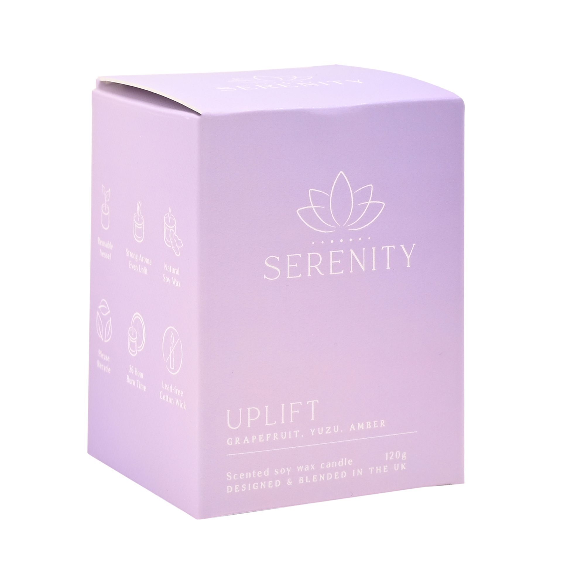 Energise and refresh with this indulgent luxury candle from Serenity. Invigorate your daily routine by giving yourself the reviving boost you deserve. Create an oasis of calm amidst the bustle of modern life. Details: - Slow burning candle with approx 26 hours burn time - Harnessing the power of oils to create an invigorating scent - Soothing purple ombre colours - Luxury gift box & wooden lid