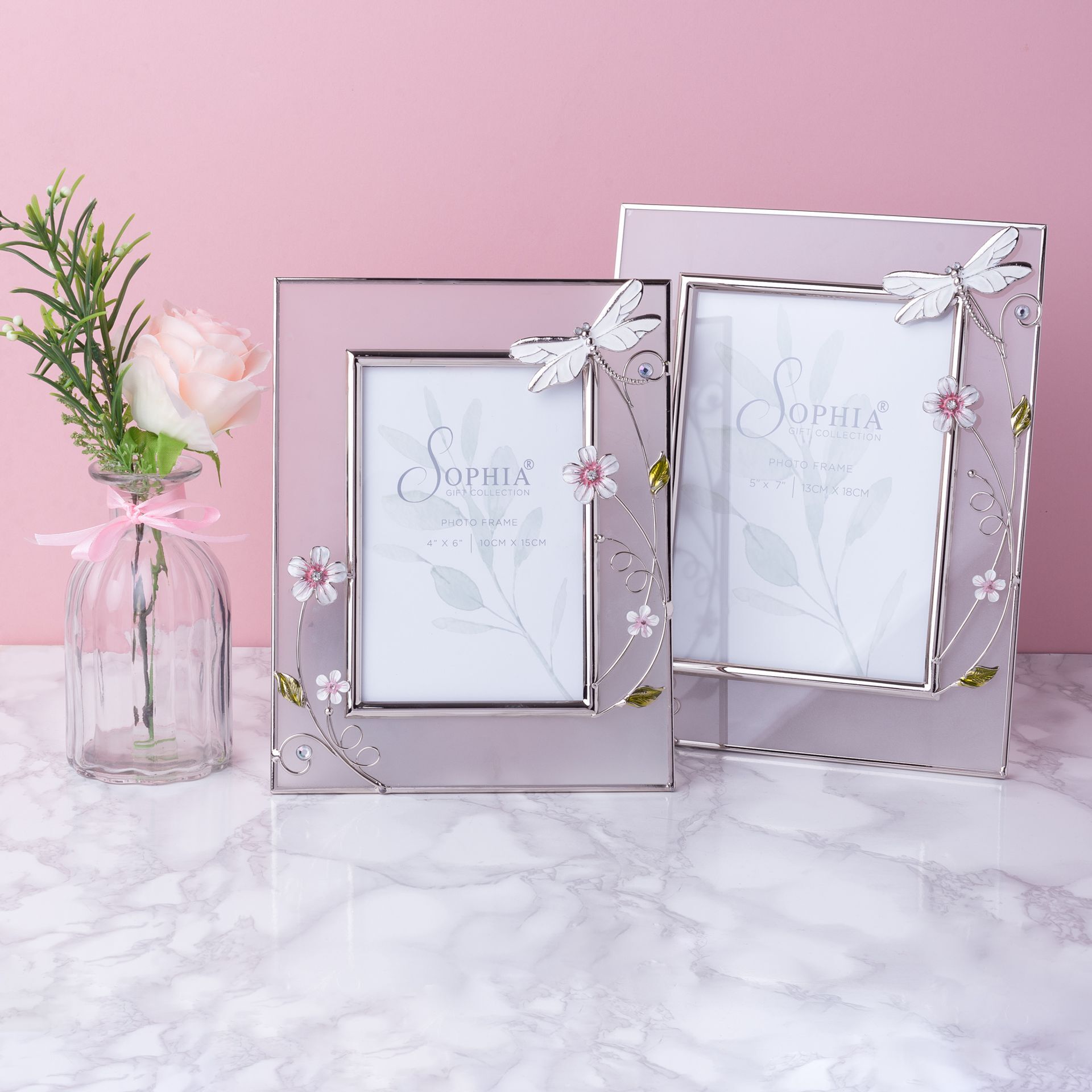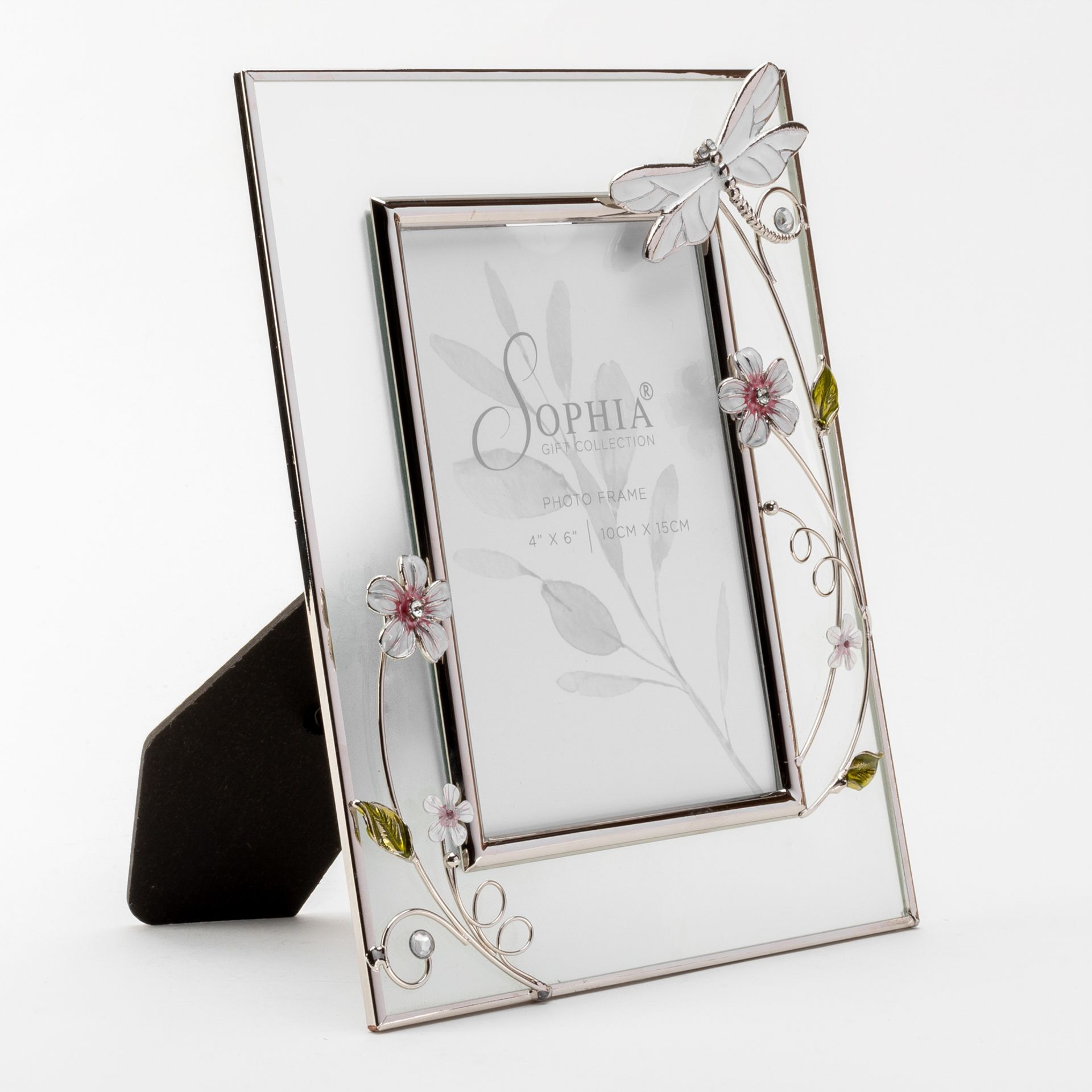 A delightful frosted glass and metal wire dragonfly photo frame with colourful enamel. From SOPHIA® - the home of sophistication in women's giftware. Details: - Hand painted colourful enamel - Silver metal framework and frosted glass panel - Dragonfly & floral details - Clear crystal details - 4" x 6" (10x15cm) aperture - Portrait or landscape - Black velveteen standing strut Part of a gorgeous matching series of accessories.