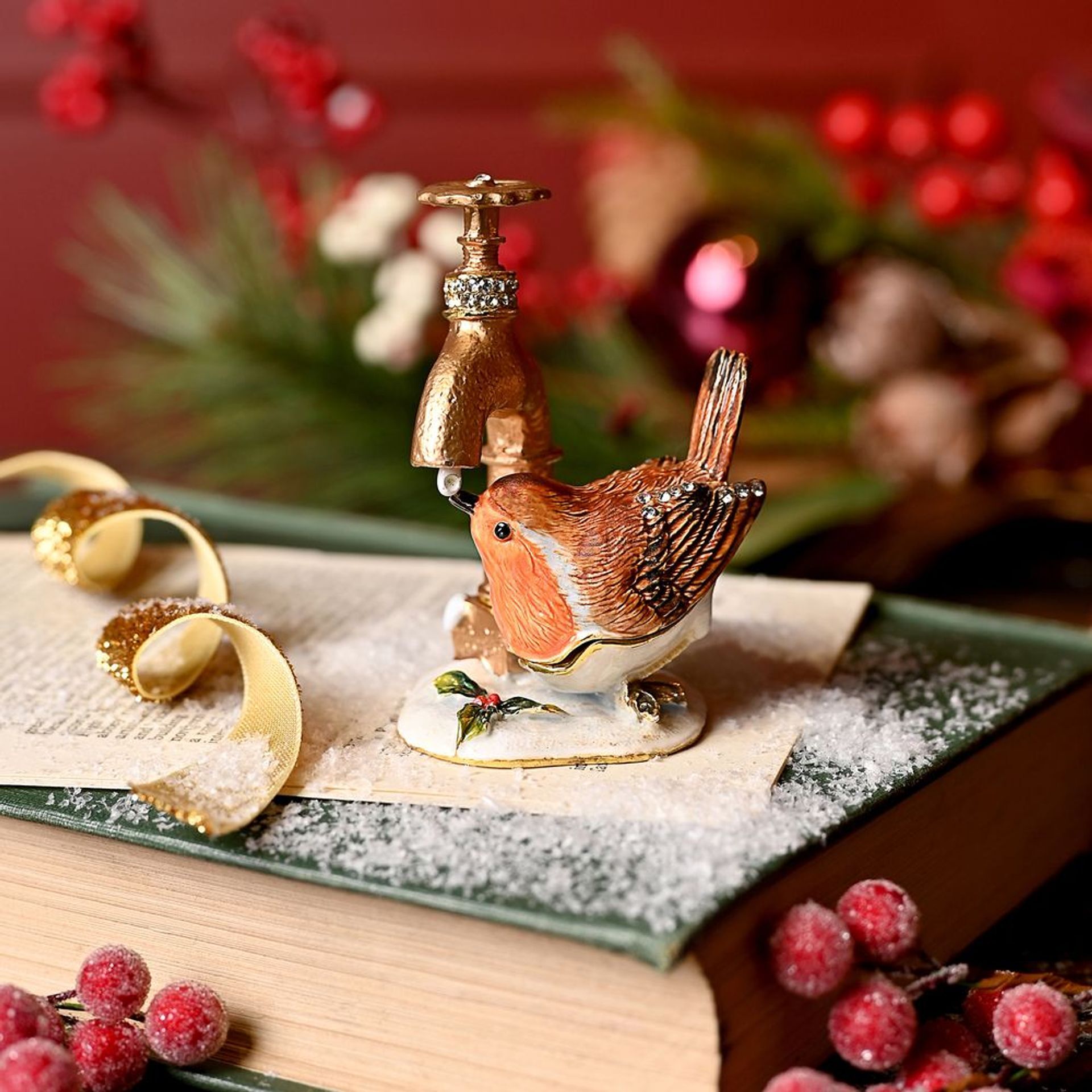 A beautiful, hand painted and crystal finished trinket box of a robin drinking from a golden tap from the Christmas Treasured Trinkets series by A Royal Affair: bringing merriment and majesty to your festive season.