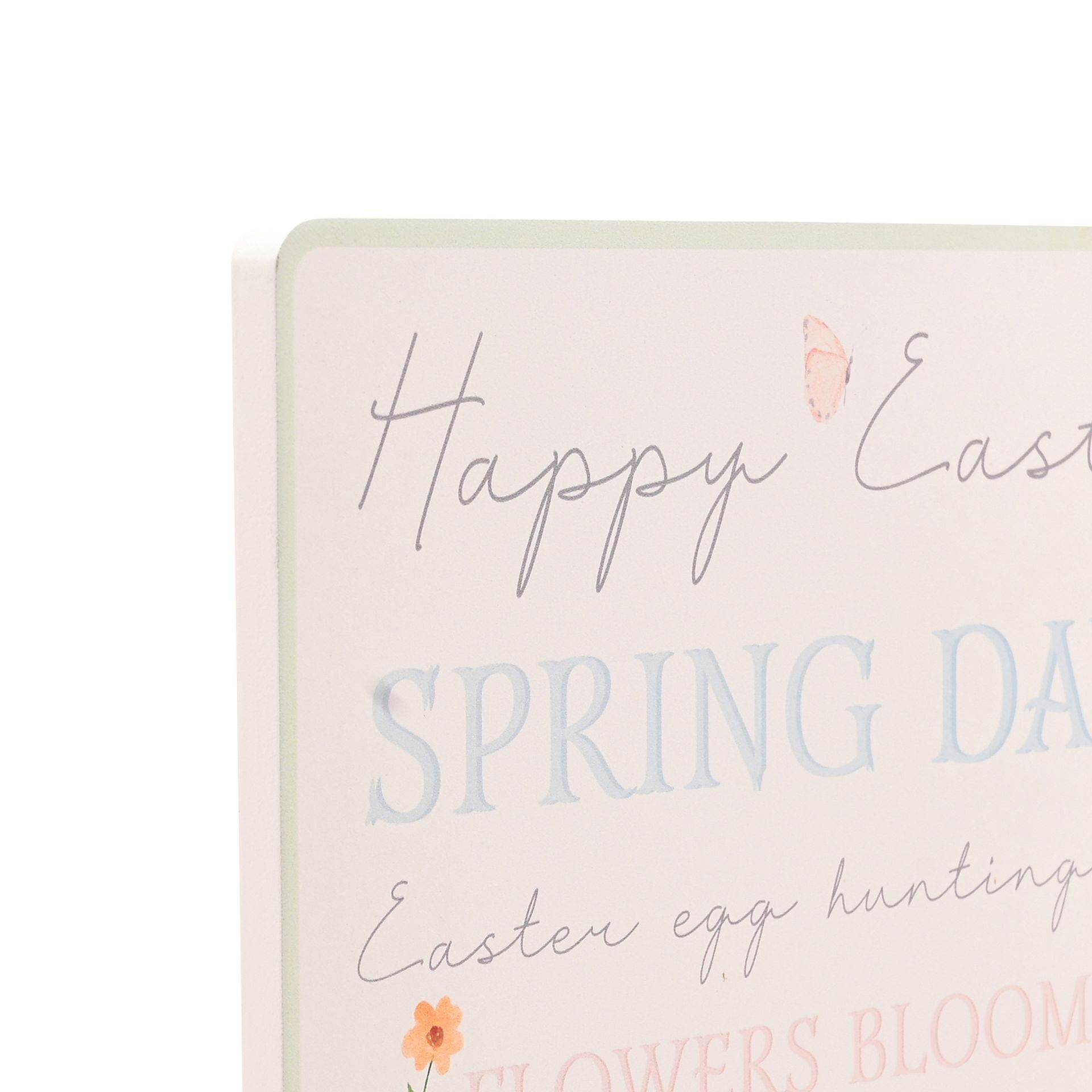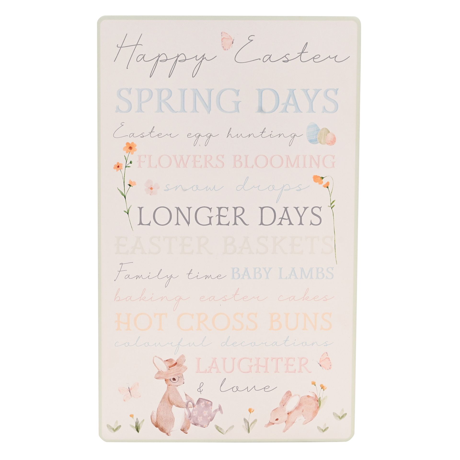 The Eggs-traordinary Gifting Co Easter Plaque features cheerful Easter lettering surrounded by illustrations of flowers, baby animals, and other spring motifs.