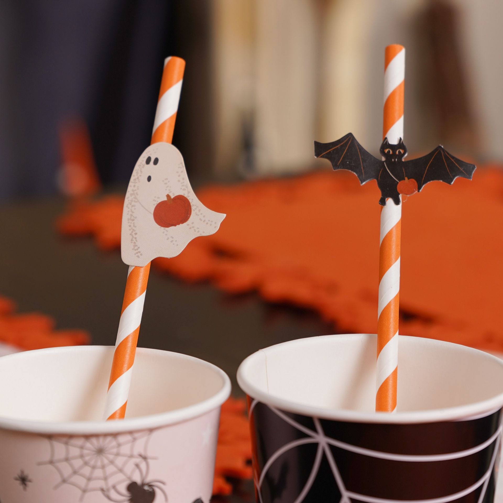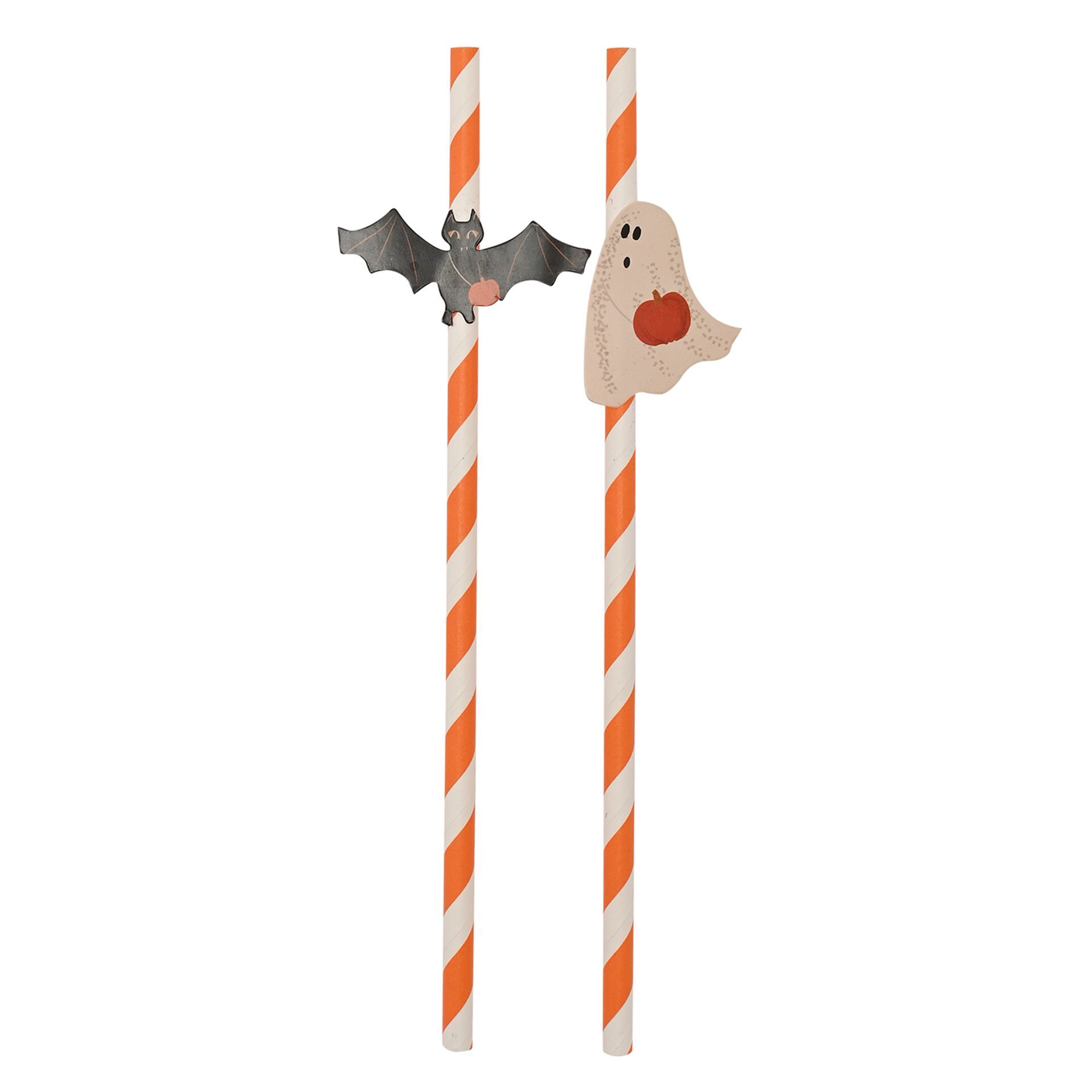 This Multi 12 set of six Halloween paper straws with cutouts (6 x 197mm) offers a stylish nod to the spooky season, blending character with seasonal charm. Each straw features an orange-and-white striped design paired with a fun Halloween motif cutout, adding a playful twist to drinks and party settings. A simple yet eye-catching accessory that brings festive flair to any Halloween celebration.