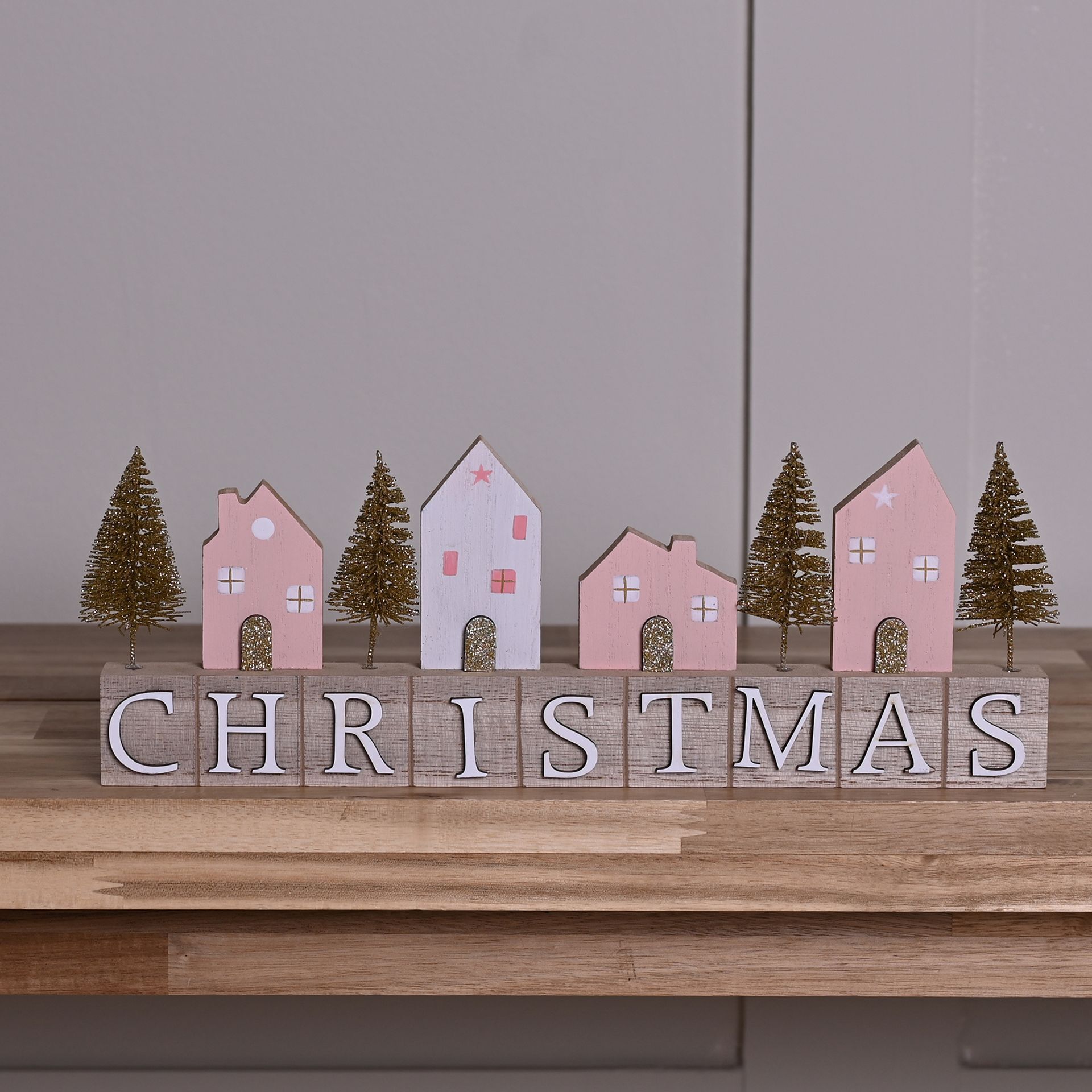 The Christmas Mantel Plaque with Glitter and Pink Houses - 30cm is a charming centrepiece for seasonal displays.