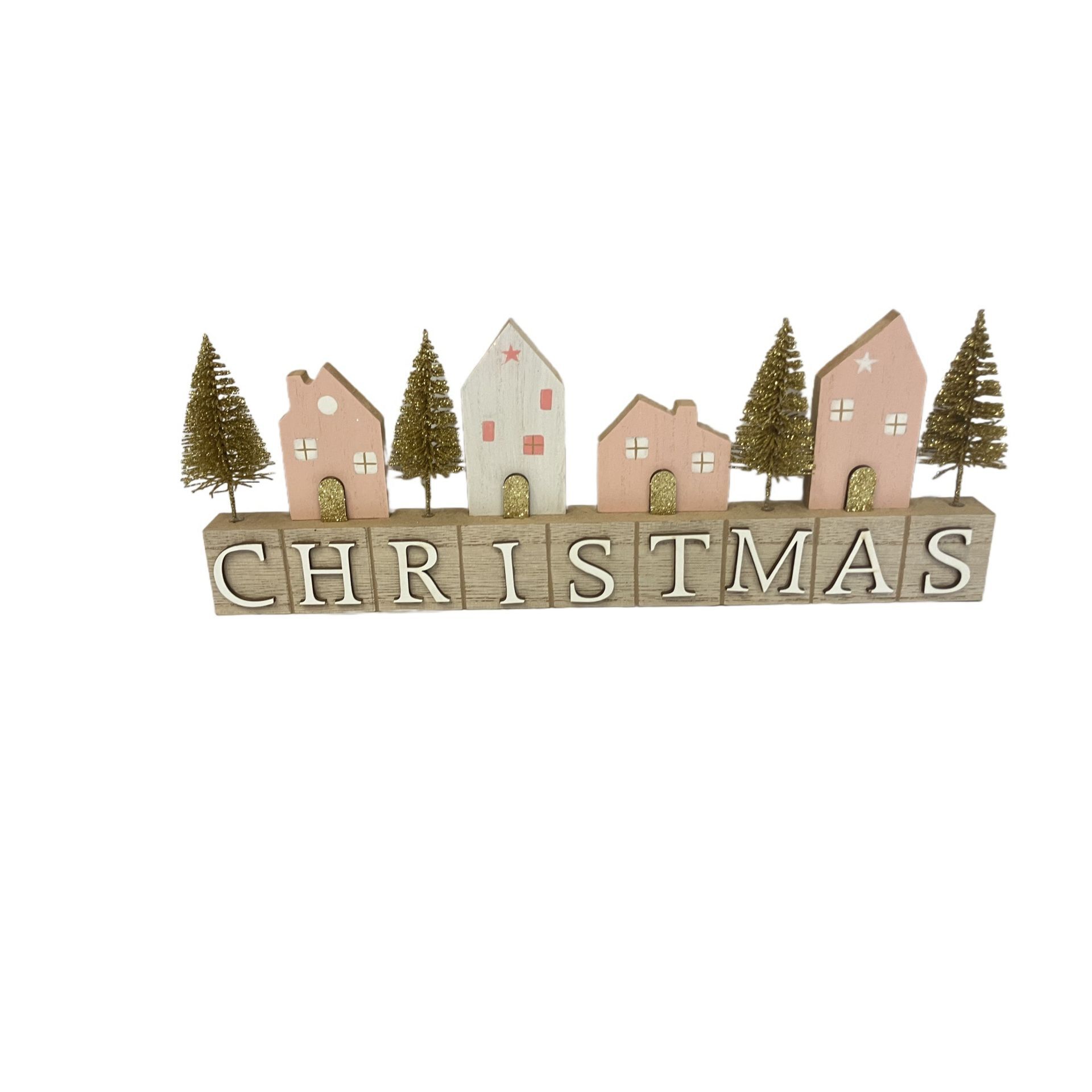 A Christmas plaque with small pink houses, miniature Christmas trees, and the word "CHRISTMAS" displayed prominently in the foreground on a wooden surface. Glitter accents add a gentle sparkle, enhancing the playful, nostalgic mood of the Chateau Rose collection.