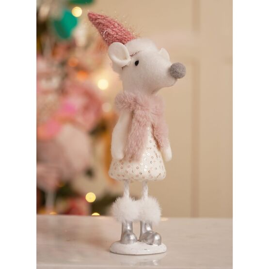 The Fabric Standing Mouse Ornament with Plush Outfit brings a cheerful character to festive collections in soft, contemporary tones.