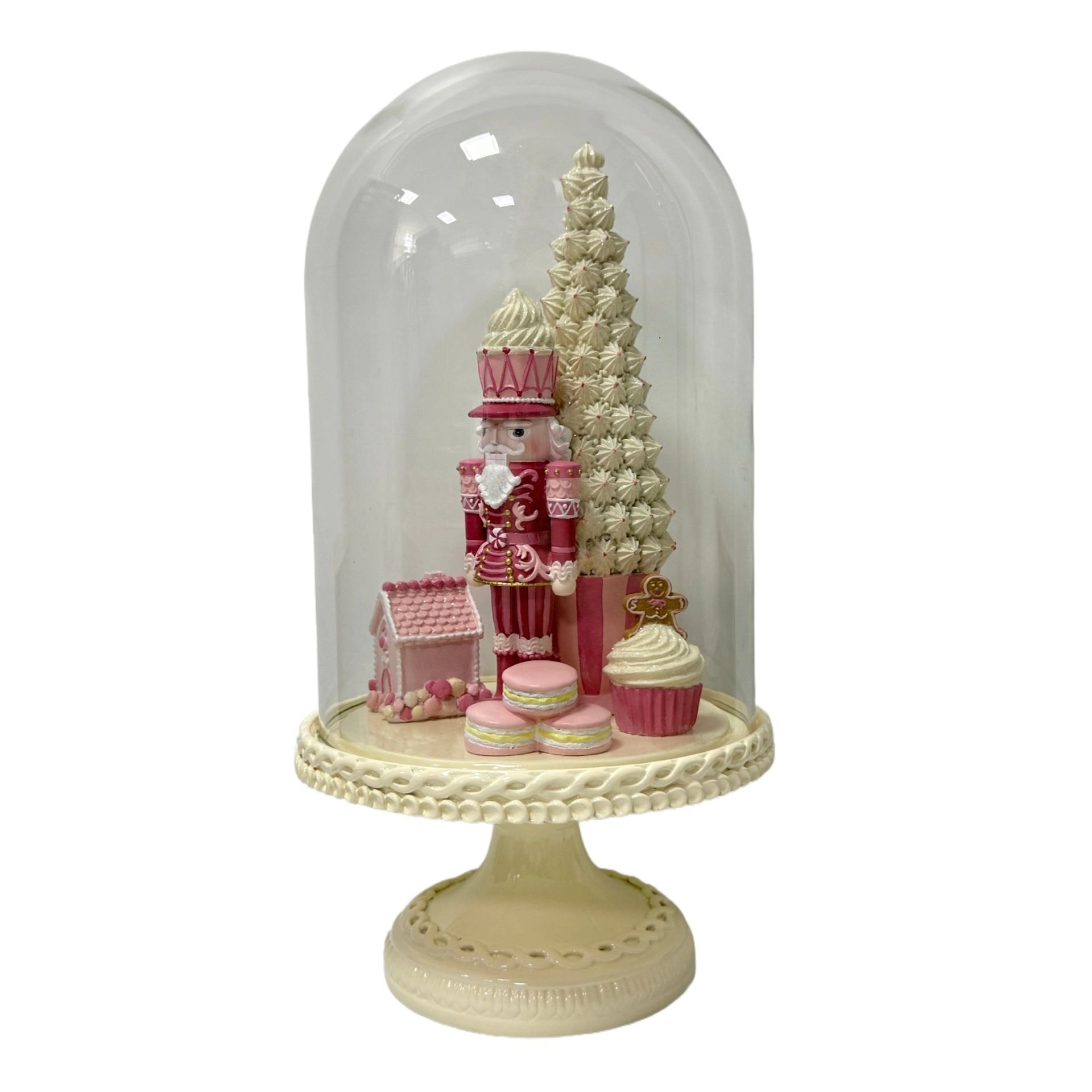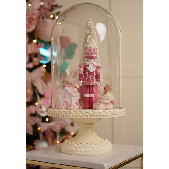 Large Resin Nutcracker with Pedestal & Glass Dome 23cm x 23cm x 41cm - Pink & White