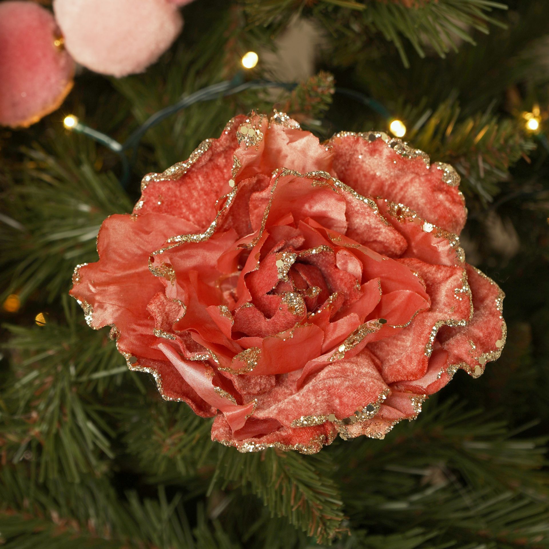A rich pink flower with layered petals and gold accents brings depth and warmth to festive trees, wreaths, or centrepieces. The built-in clip allows easy styling across displays, enhancing texture and visual balance in seasonal ranges.