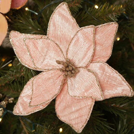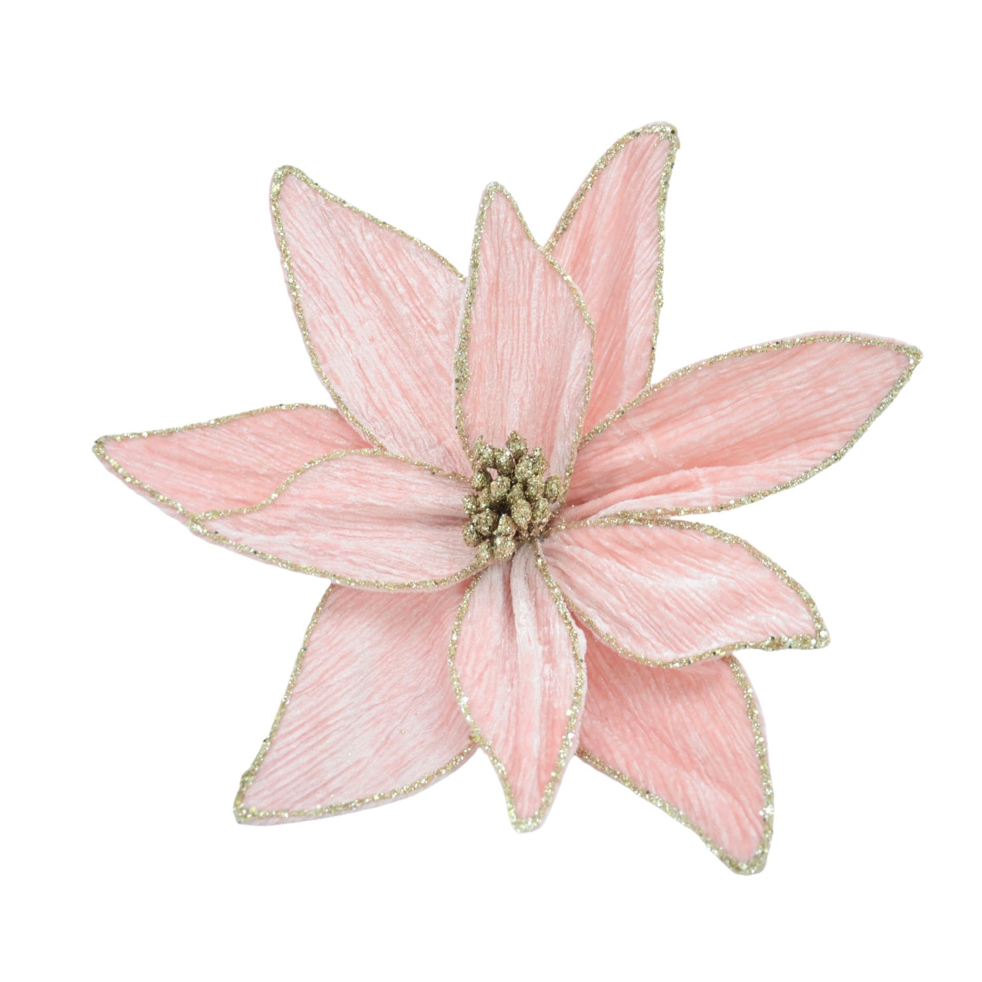 A soft pink flower with layered petals and a central stamen cluster creates a delicate visual focus for trees or table settings. The clip fitting allows easy placement, offering flexibility across merchandising and decorative displays.