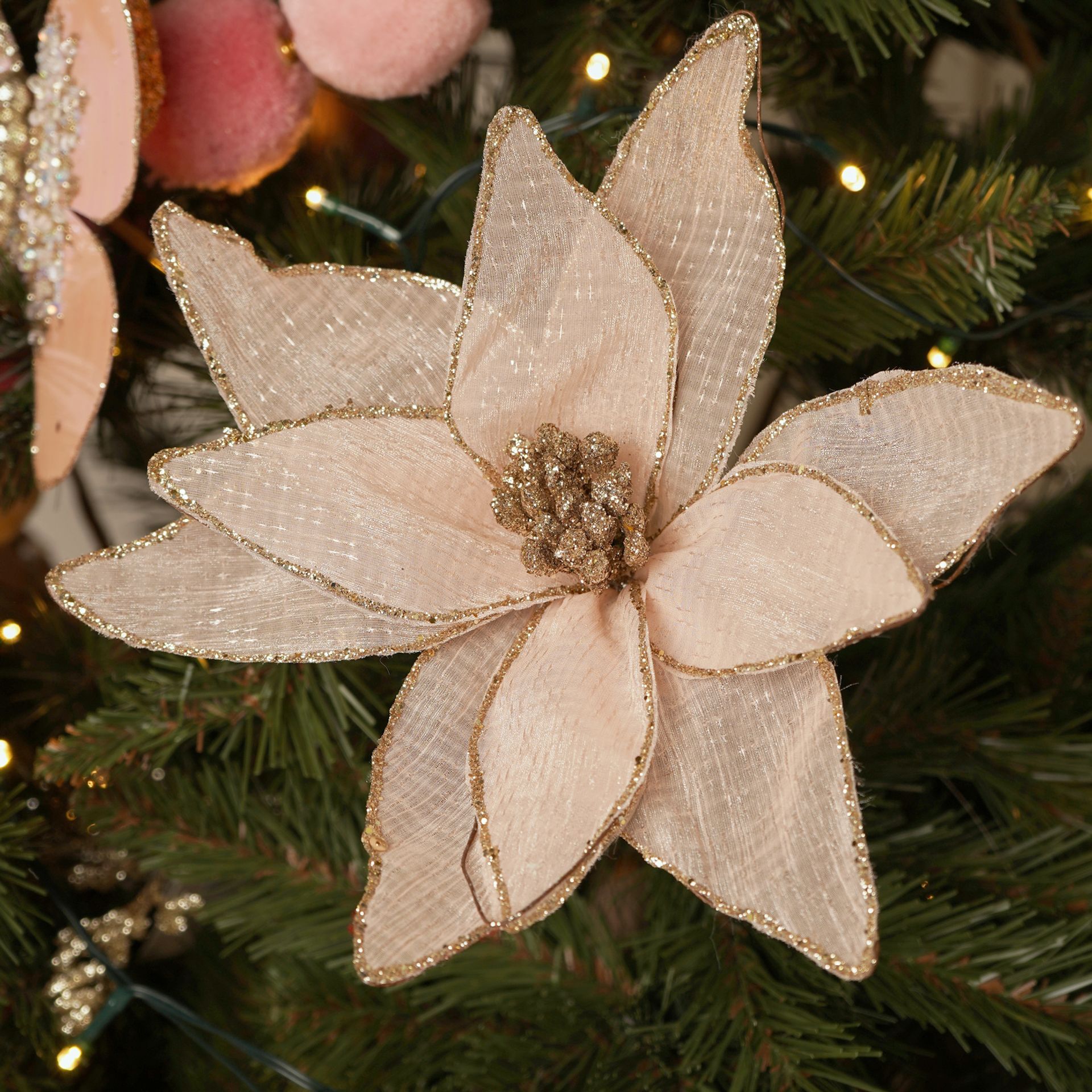 Featuring pale pink petals with subtle gold detailing, this versatile clip-on flower adds softness trees, wreaths, or centrepieces.