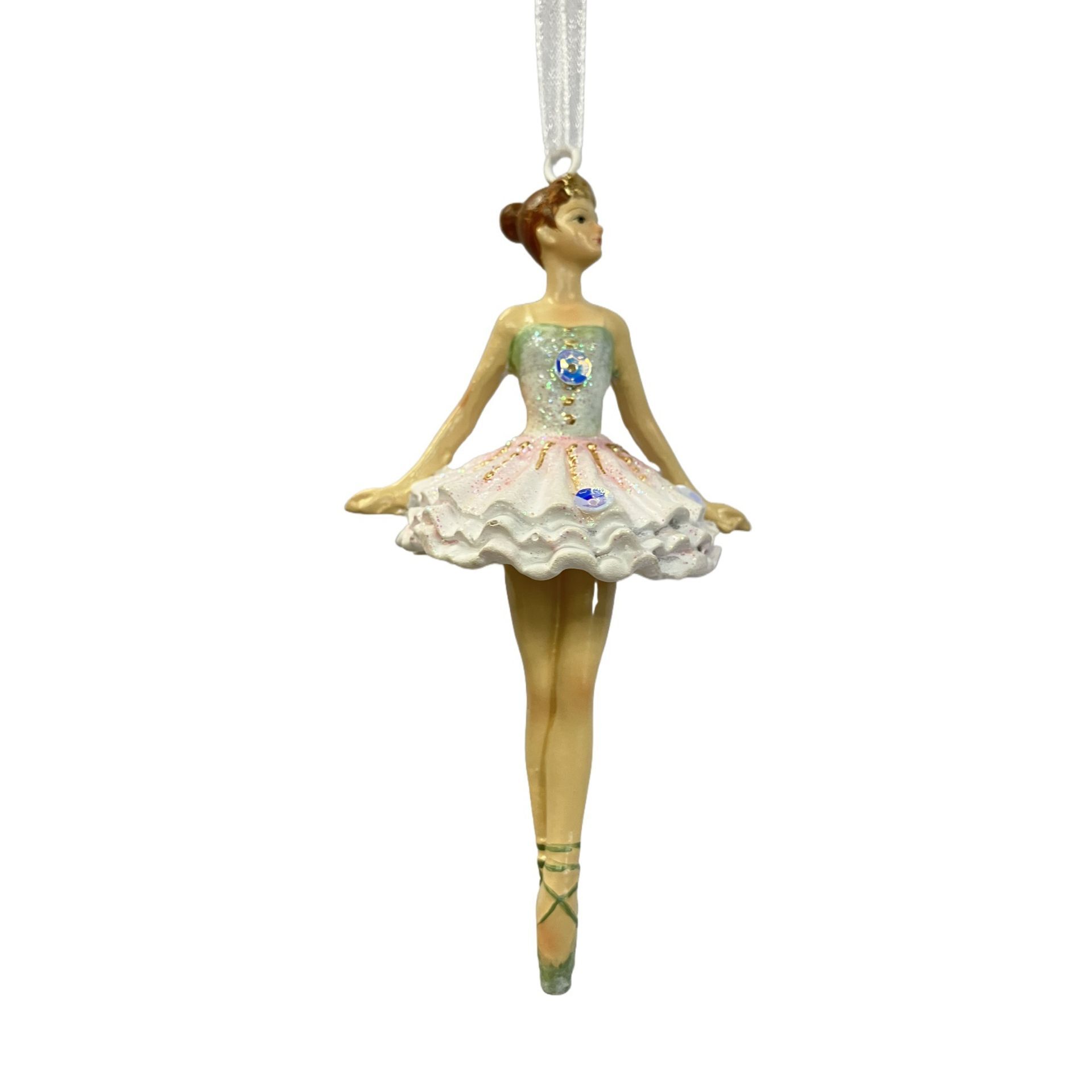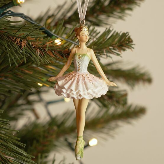 A delicate ballerina in soft pastel tones detailed with sparkly accents adds grace to tree décor or display arrangements.